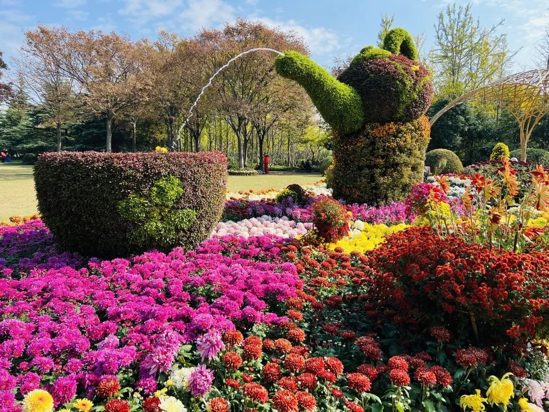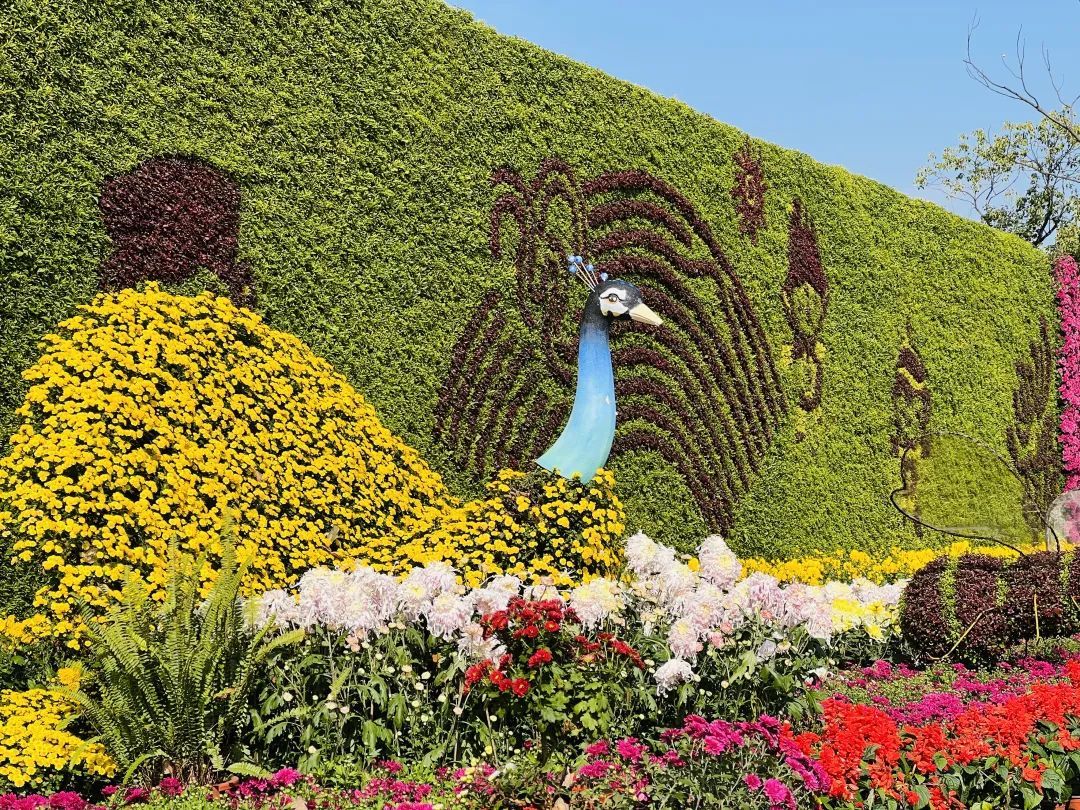 这组名为“勇立潮头”的大型景观以红绿草种植出杭州第19届亚运会的会徽图形,吉祥物“宸宸、琮琮、莲莲”跃然于景墙上,“孔雀”和“蜜蜂”在各色菊花组成的菊海里嬉戏,一幅潮涌亚运画面缓缓打开。