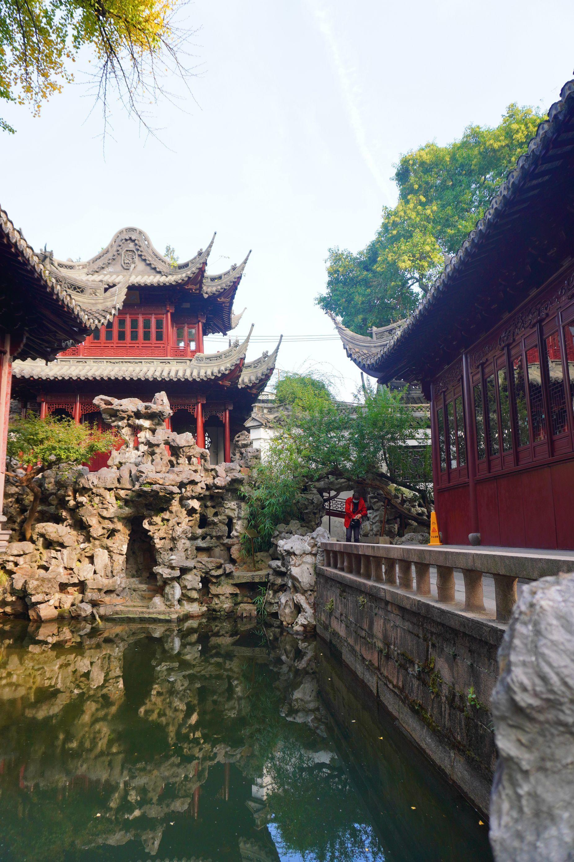 穿过时光的迷雾,步入秋末冬初的豫园。这里水波如绮,清幽宁静,古朴雅致。亭台楼阁、泥塑砖雕、名树古木、石峰小桥,都像被添加了暗调的中式古风滤镜,凭栏远观,好一幅洞天福地的美景!