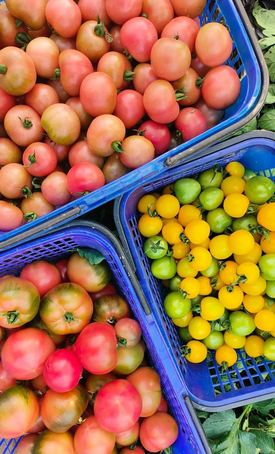 闵行人家门口的天然蔬果基地——羊鑫果蔬合作社里,最近迎来了秋冬季番茄的成熟期。走进番茄大棚,整3亩的番茄苗用力地向上生长着,钻进去探头一瞧,鲜嫩的草莓番茄个头不大,但壮壮实实地挂在枝头。红美人品种则比市面上的圣女果要大一圈,还有黄美人、青美人,小巧玲珑的身子里面,口感到底怎么样呢?