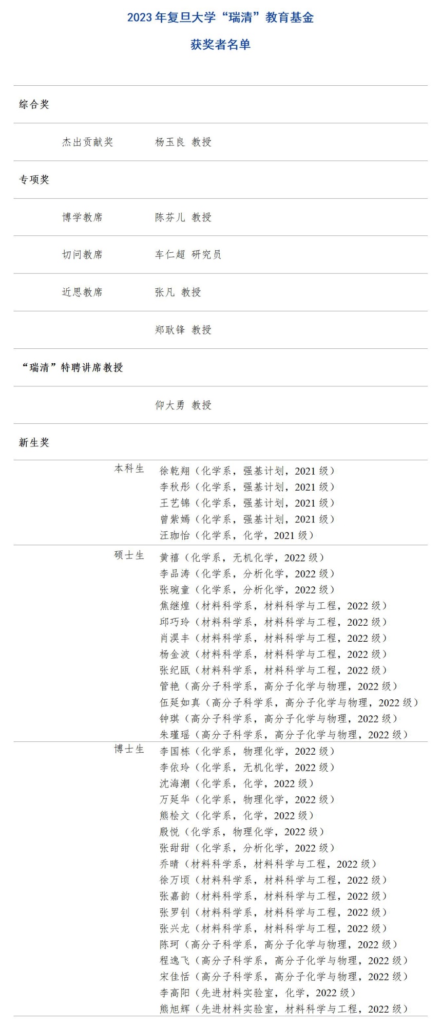 11月18日,第二届复旦大学“瑞清”教育基金颁奖,复旦化材领域优秀师生和校友分获四大类、六大项奖。现场颁发杰出贡献奖,揭晓专项奖“博学”、“切问”、“近思”三大教席和特聘讲席教授。此外, 34名同学获新生奖。
