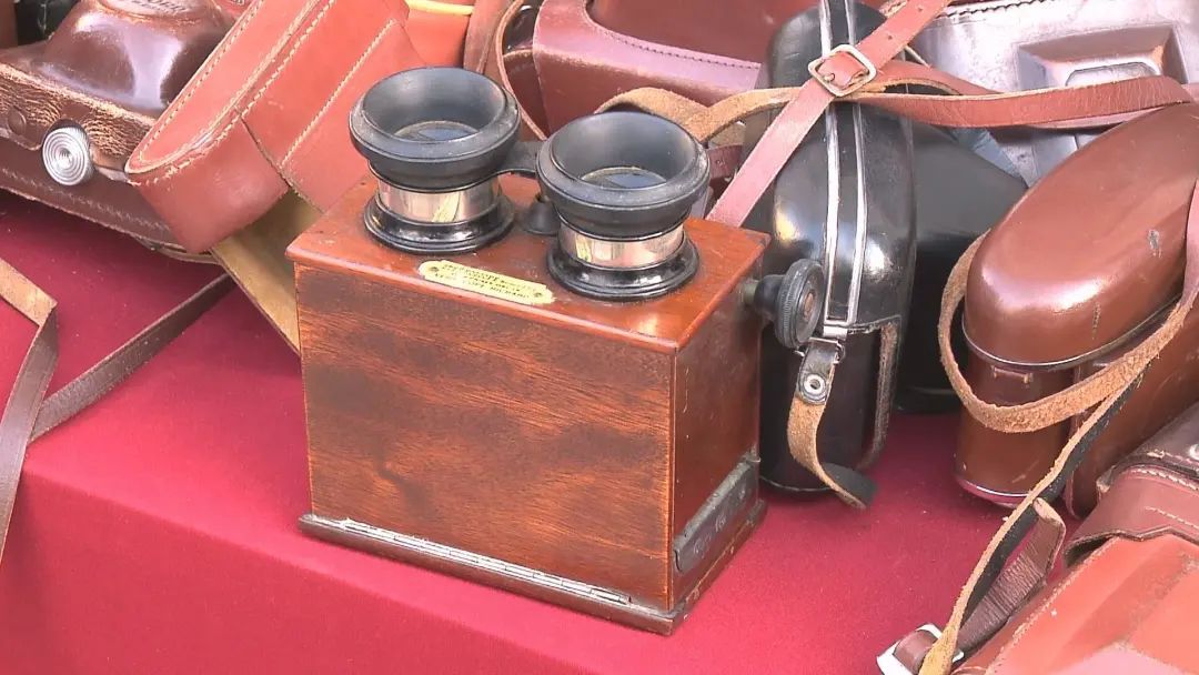 像这台德国造的立体观片器,已经有百年历史了,可以观看立体照片。一位相机爱好者向记者详细介绍,“用立体相机拍的,需要拍两张照片。拍出来以后装片夹,然后填到里面。调焦后,就可以看到里面是一个立体的照片,效果非常好。这已经有百年历史了,老古董了”。