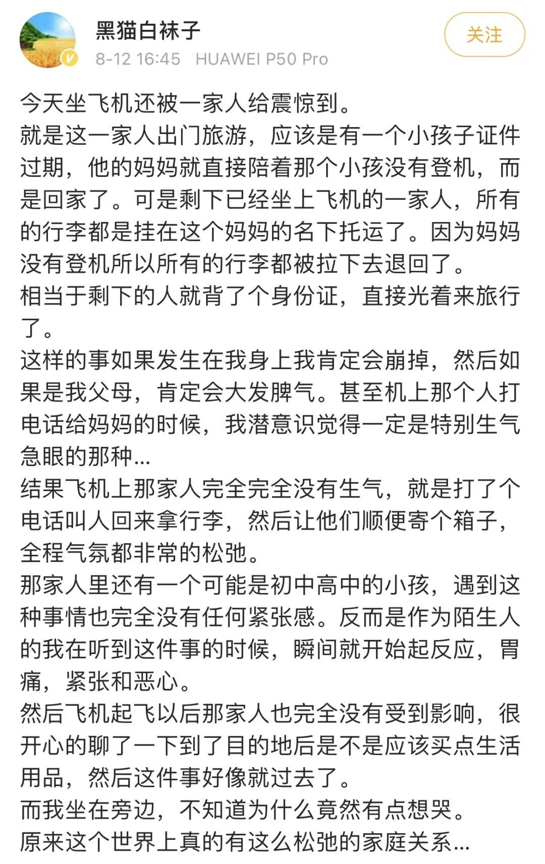 它源于博主@黑猫白袜子发的一则微博,记录了他坐飞机旅游见到的一家人,处理突发事件时的淡定平和。“原来这个世界上真的有这么松弛的家庭关系。”