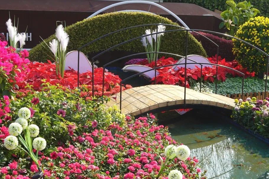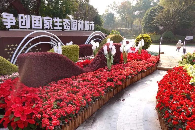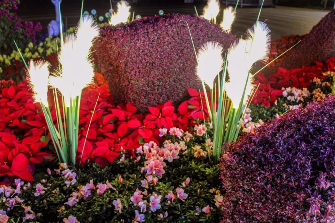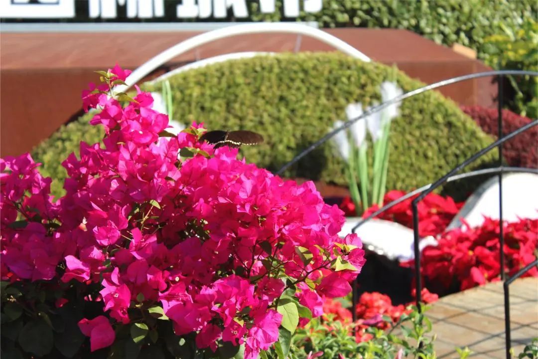 植物选用三角梅、丽格海棠、小丰花月季、圣诞花等十多个品种,以带状、丛状、点状自然式组合,展现了植物自然组合的群体美,增加趣味性。