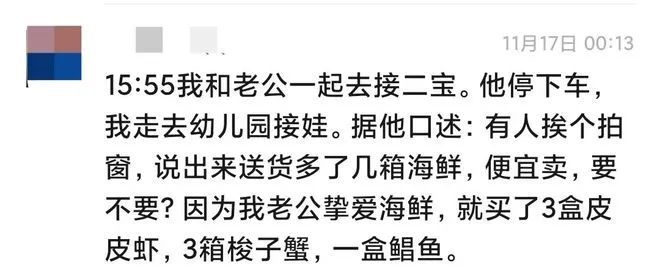 9月17日傍晚,梁女士驾车回家,准备把车停在小区附近的路边。车还没停稳当,梁女士就发现,自己车后面有一辆货车也跟着停了下来,紧接着走下来一个大叔,询问梁女士要不要买海鲜。梁女士看到,这位大叔身上穿着一件马甲,上面只写了两个大字:配送。