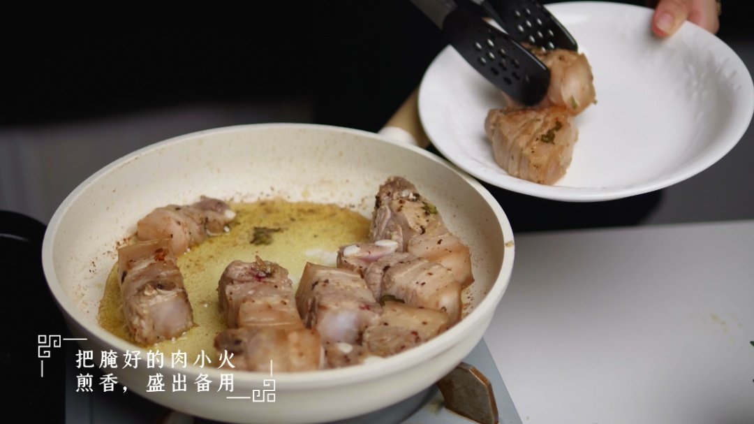 2.将五花肉与腌料混匀,腌制1小时,腌好的肉用小火煎香,盛出备用。