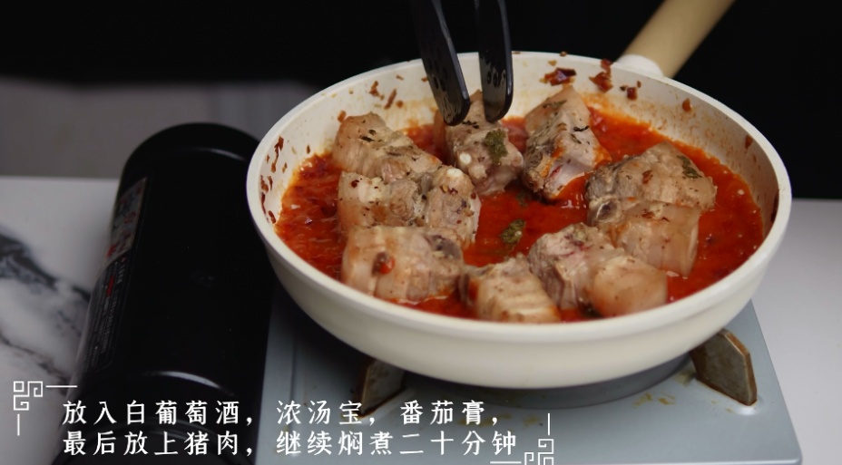 4.放入白葡萄酒、浓汤宝、番茄膏,最后放上猪肉,继续焖煮20分钟完成。