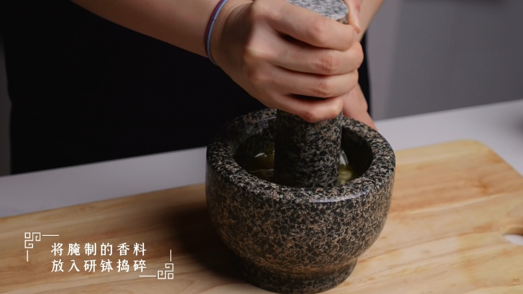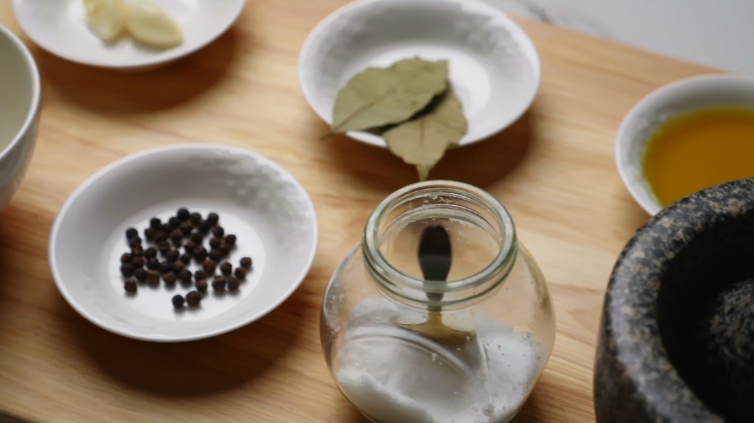 1.制作腌料:将盐、橄榄油、柠檬、黑胡椒、月桂叶、大蒜放入研钵捣碎。