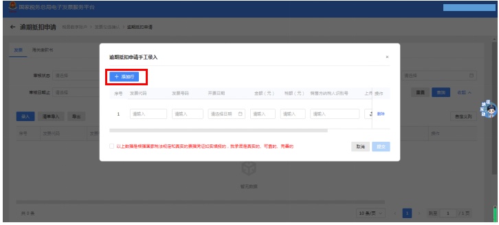 第八步:如还有其他发票需要录入,点击“添加行”,即可录入下一张发票。