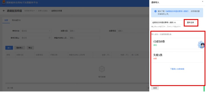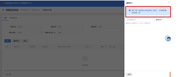 第二步:在右侧弹出框内,点击“逾期抵扣申请发票导入模板”,下载《逾期抵扣申请发票导入模板》,并按模板要求填写相应内容。