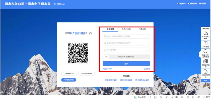 第一步:进入国家税务总局上海市电子税务局首页,点击右上角“新版登录”,在“企业业务”界面输入登录信息,点击“登录”。