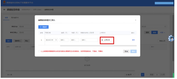 第六步:在逾期抵扣申请手工录入界面填写正确的发票信息后,点击“上传文件”。