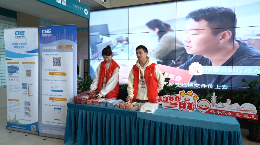 在人来人往的南翔医院门诊大厅,“一网通办”五周年系列宣传易拉宝被放置在显眼位置,向市民展示“一网通办”五年来在医疗健康领域的创新举措。
