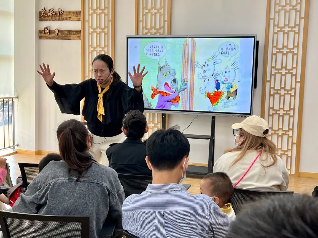 “陈伯吹姐姐讲故事”首场活动热闹开展,来自陈伯吹实验幼儿园的杨鹭老师为亲子家庭带来了《小兔乖乖》儿童绘本,故事情节简单有趣,反复出现的重复性对话,适合幼儿跟着故事学说、学唱。故事中小兔子们和大灰狼的角色性格鲜明,且具有表演性,也适合进行亲子角色扮演。