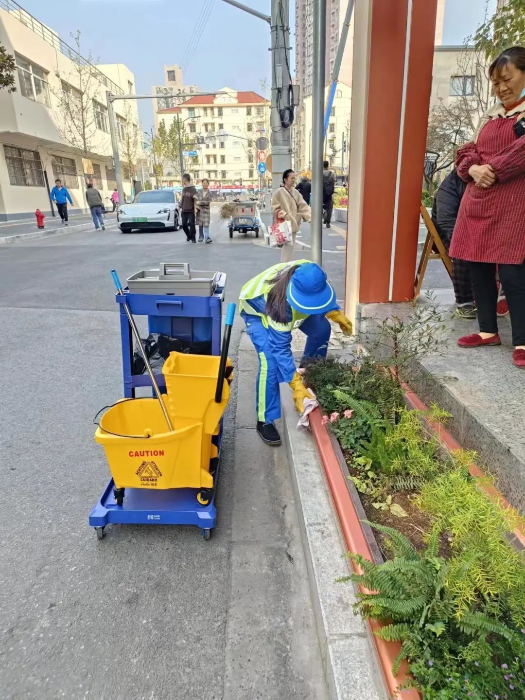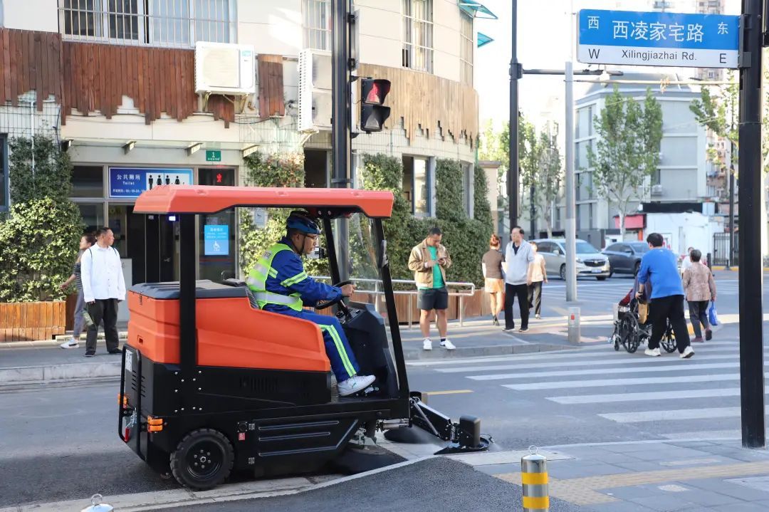 在这样充满“烟火气”的街区,如何实现高品质的精细化管理?欣望公司在吸纳原有“路长制”管理经验基础上,结合街区的功能特色和业态场景需求,引进绿色环保的环卫作业设备,实现“大中小型相配套,机扫人保相结合”的“现代化、立体式、全覆盖”的保洁模式。扫地车、冲洗车、人工保洁轮番上阵,沿街人行道每日冲洗,废物箱、电线杆等“城市家具”每日擦洗,从街头到巷尾都让它保持“清爽”。