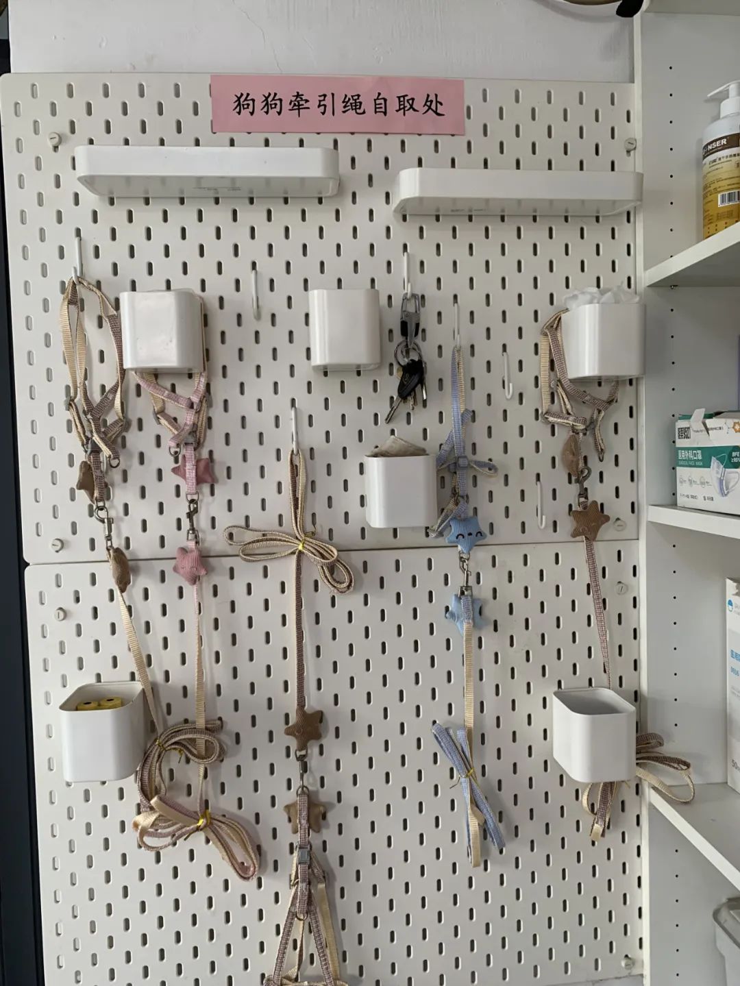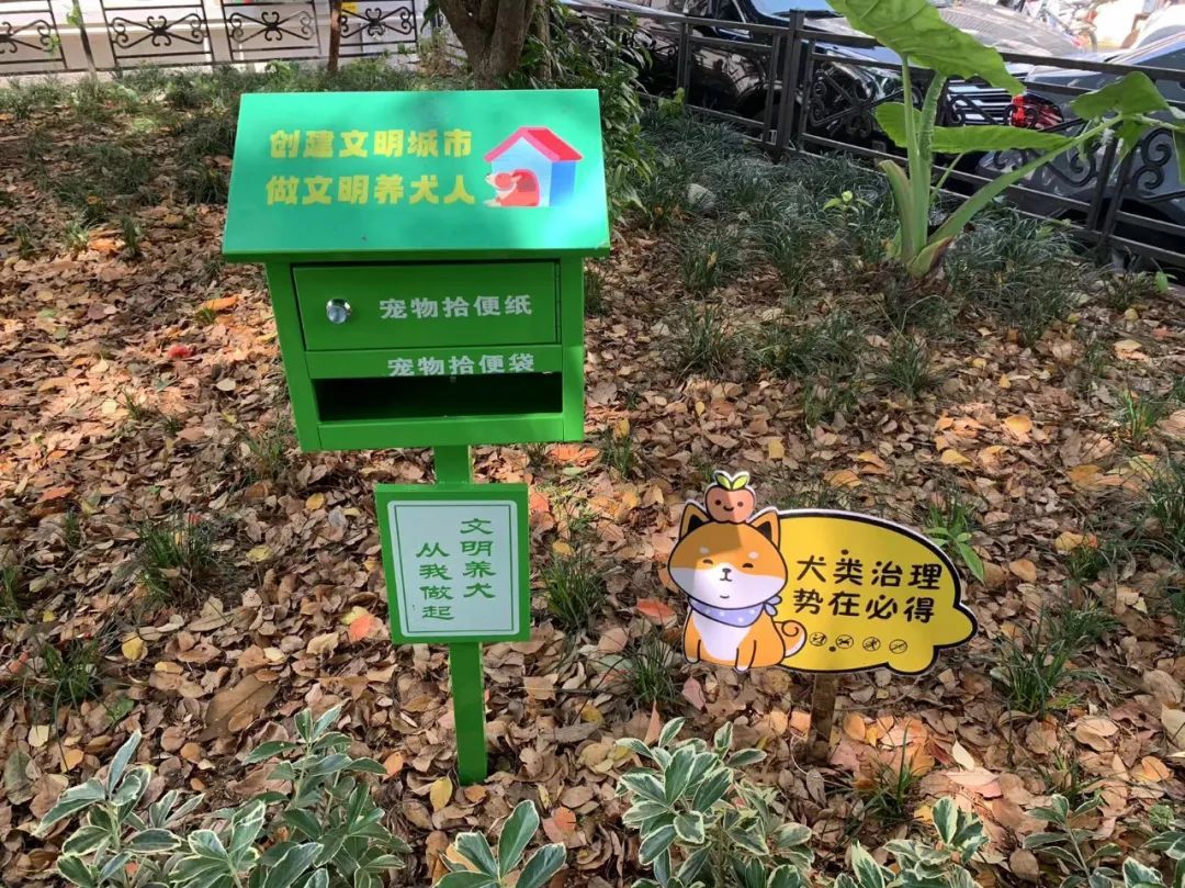 如今,小区内设置了两个固定的遛狗场所,大型狗在大花园,中小型在小花园。花园内安装了宠物拾便器和文明养犬标识牌,里面放置清洁用品;门卫室添置文明养犬宣传册、共享狗绳,以供养犬居民需要时自取。