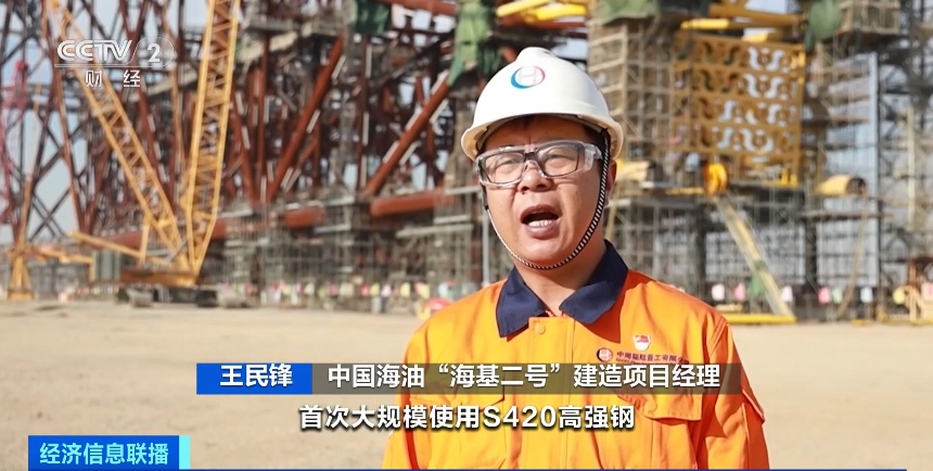 中国海油“海基二号”建造项目经理 王民锋:项目在国内导管架平台建造中首次大规模使用S420高强钢,在提升强度的同时大幅降低结构总重,在300米以上水深导管架平台设计建造技术领域走在亚洲前列。