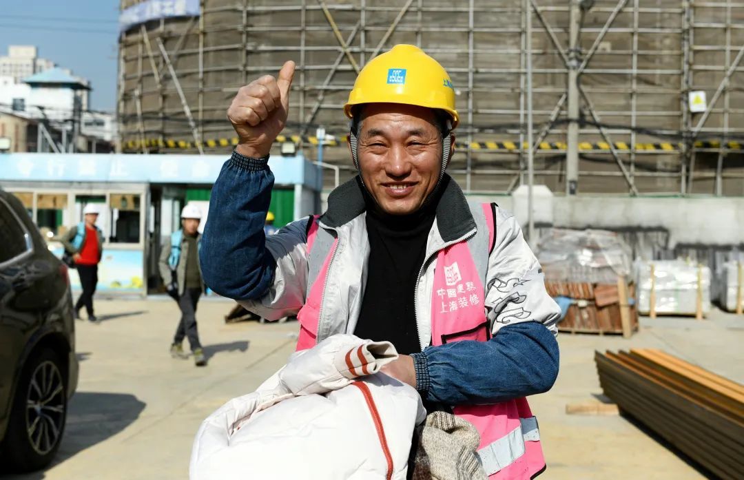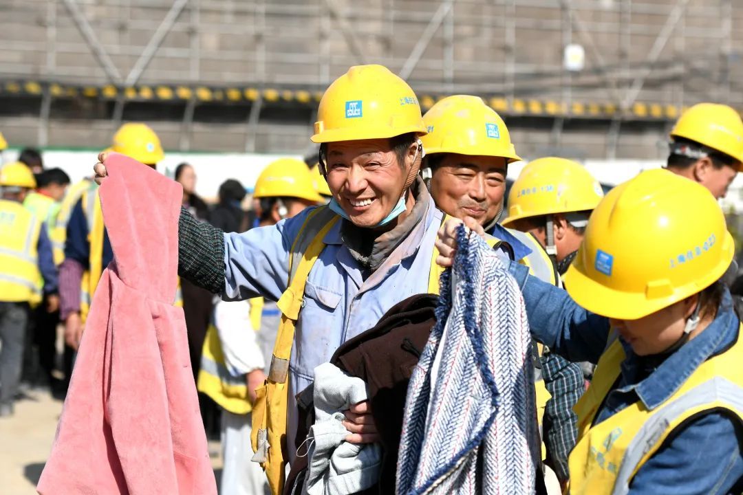 工友们领取到心仪的用品和衣物后,幸福的笑容爬满了脸庞,他们对着相机镜头纷纷举起了大拇指。来自甘肃庆阳幕墙班组的巩师傅告诉记者,他的爱人前一天还在给他发消息叮嘱他买两件御寒的衣物,没想到今天他就免费领到了,这让他非常开心。