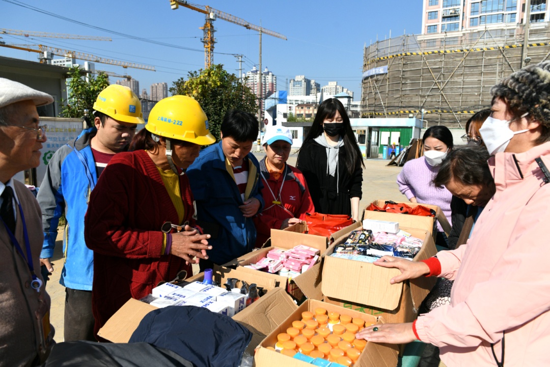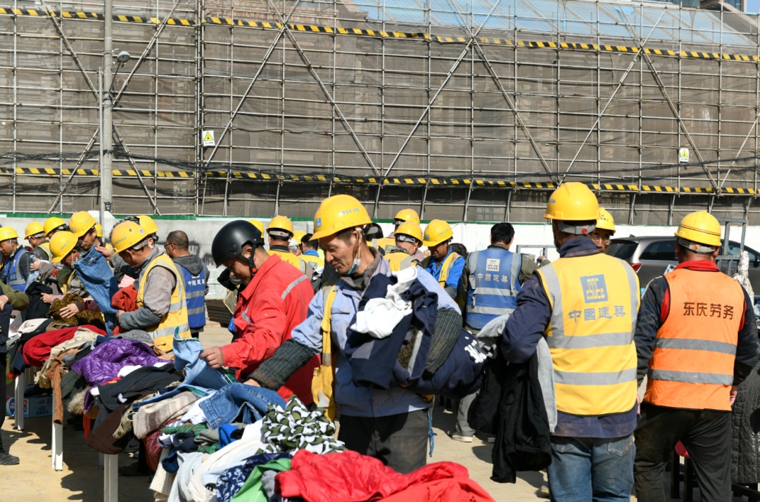 11月21日上午十点半,中建八局上海公司第二分公司安康苑一期项目办公区广场上人头攒动,两排长桌摆满了棉衣、棉被、线衣,以及洗面奶、护手霜等生活用品。数百名刚从施工一线下工的工友们,正挑选着适合自己的衣物。