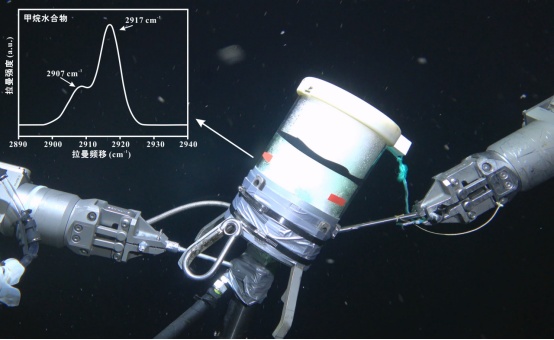 近日,国际学术期刊《地球化学观点快报》以封面文章形式报道了中国科学院海洋研究所最新研究成果。科研人员基于自主研制的深海原位拉曼光谱探测系统,构建了天然气水合物上升时随水深变化的演化模型,并通过深海原位实验首次证实了天然气水合物可携带冷泉气体到达海表。