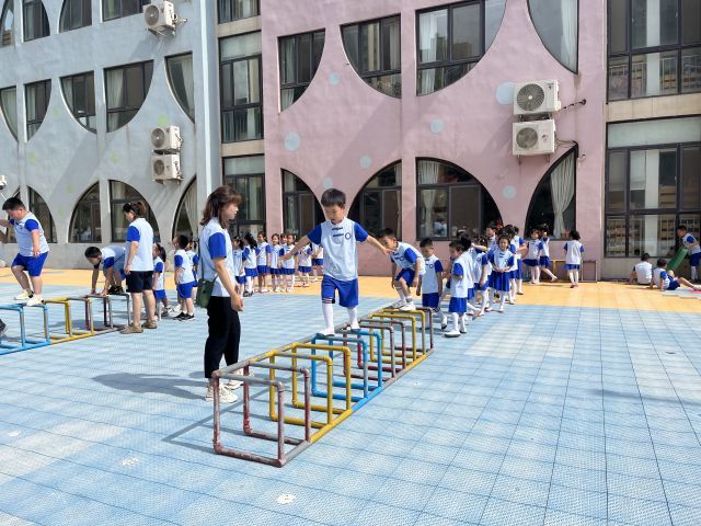 烟台开发区八角幼儿园作为市级幼小衔接试点园,一直致力于科学推进幼小衔接工作,结合《关于大力推进幼儿园与小学科学衔接的指导意见》中对于幼儿喜欢运动的教育建议和体能训练及动作发展要求,为进入小学打下良好基础,老师们根据孩子的年龄特点及发展水平,把不同的器械巧妙结合,通过走、跑、跳、钻、爬等动作的锻炼,开展“体能大循环”活动,在活动中培养幼儿规则意识、团队合作的品质和强健的体魄。
