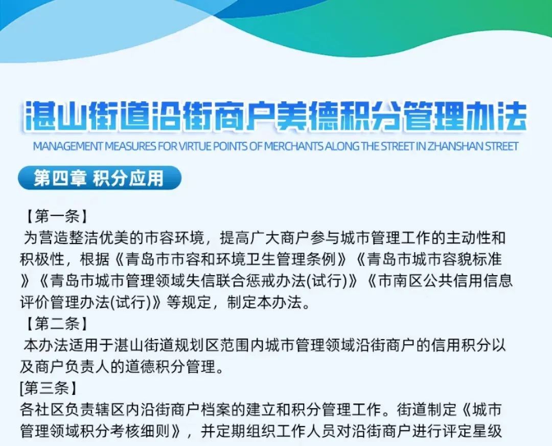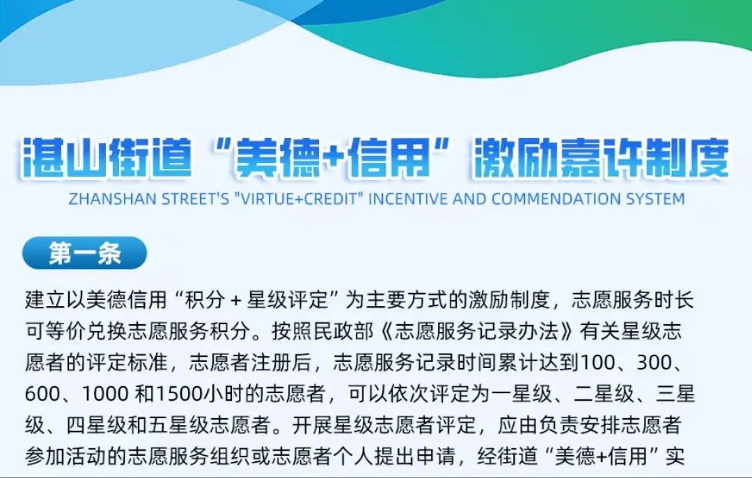着力加强顶层设计,将美德信用制度化建设与文明城市、文明行业、文明家庭、文明标兵、文明班级等文明创建工作有机融合,以积分制管理为抓手,积极探索建立美德信用转化机制,健全《湛山街道“美德信用之星”居民评选和管理办法》《湛山街道沿街商铺美德信用积分管理制度》等工作制度,着力构建起“善治提升美德、美德转化信用、信用促进发展”的文明实践新路径。