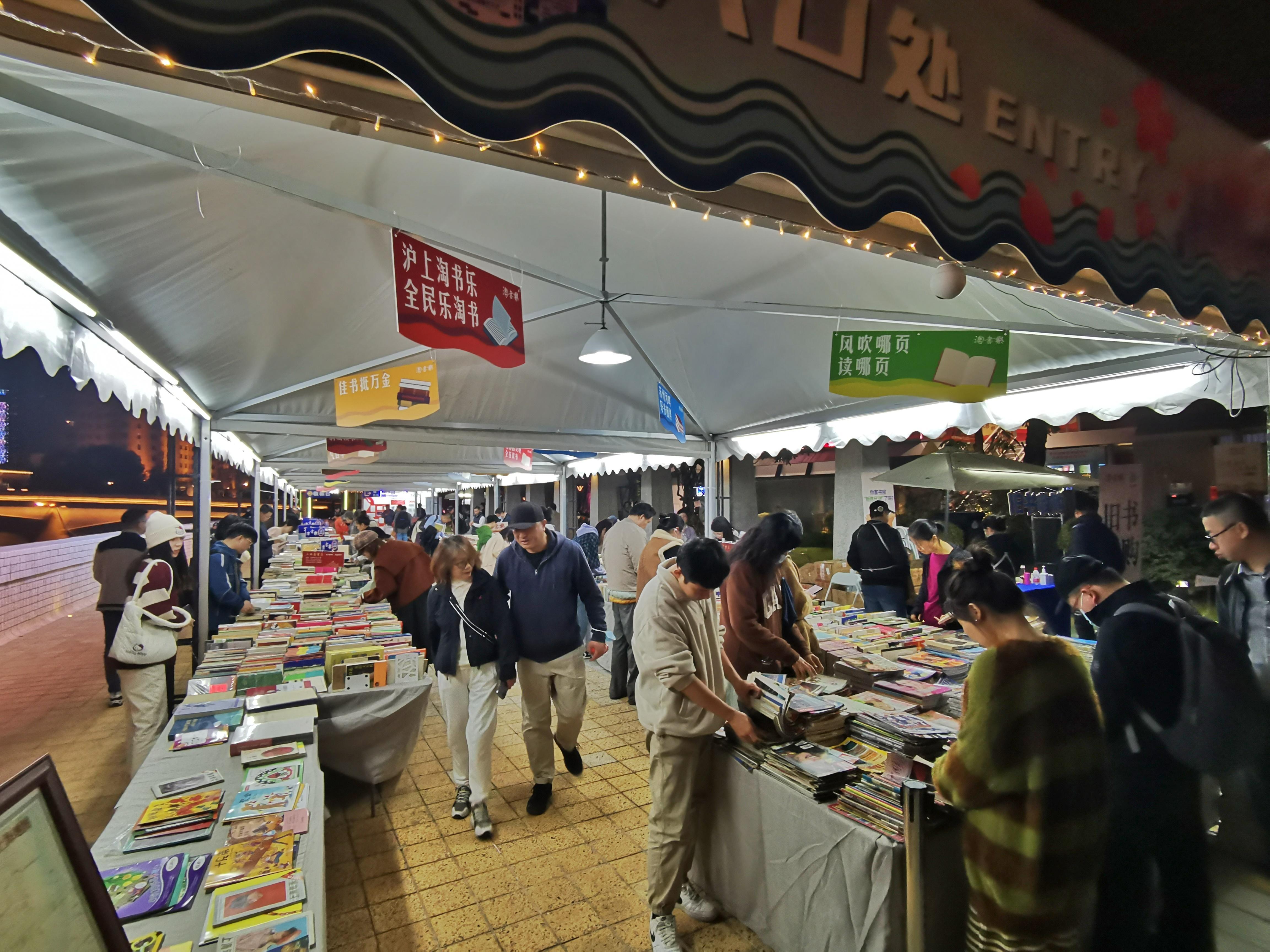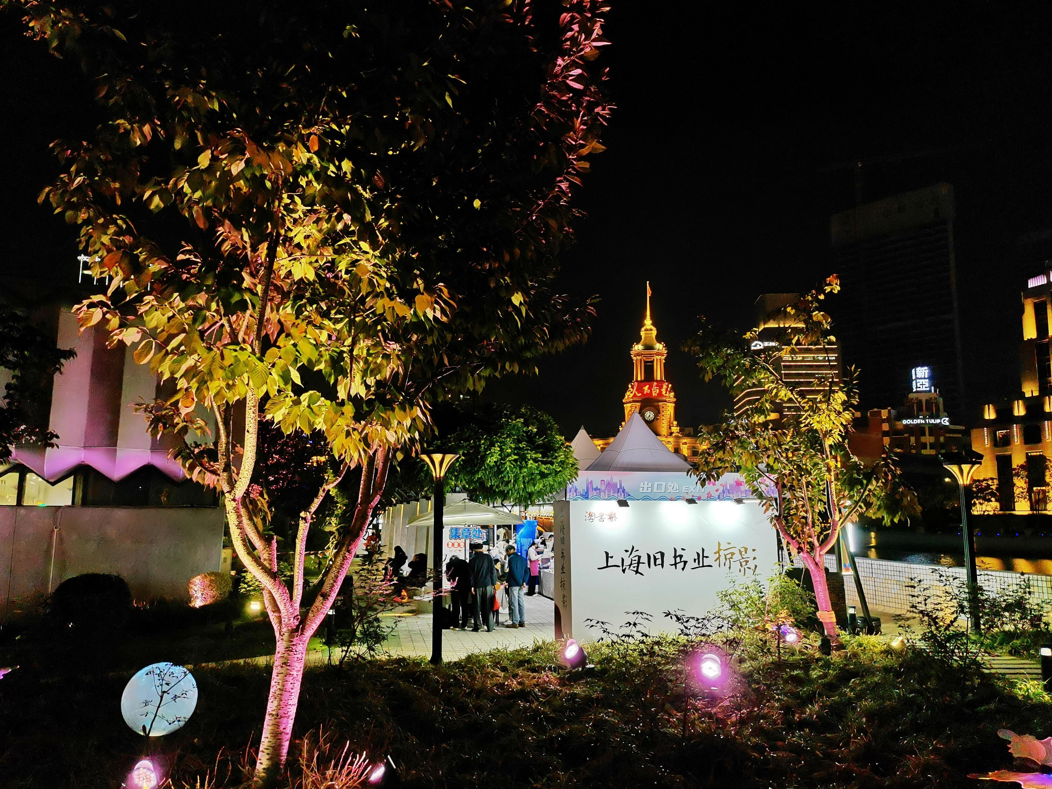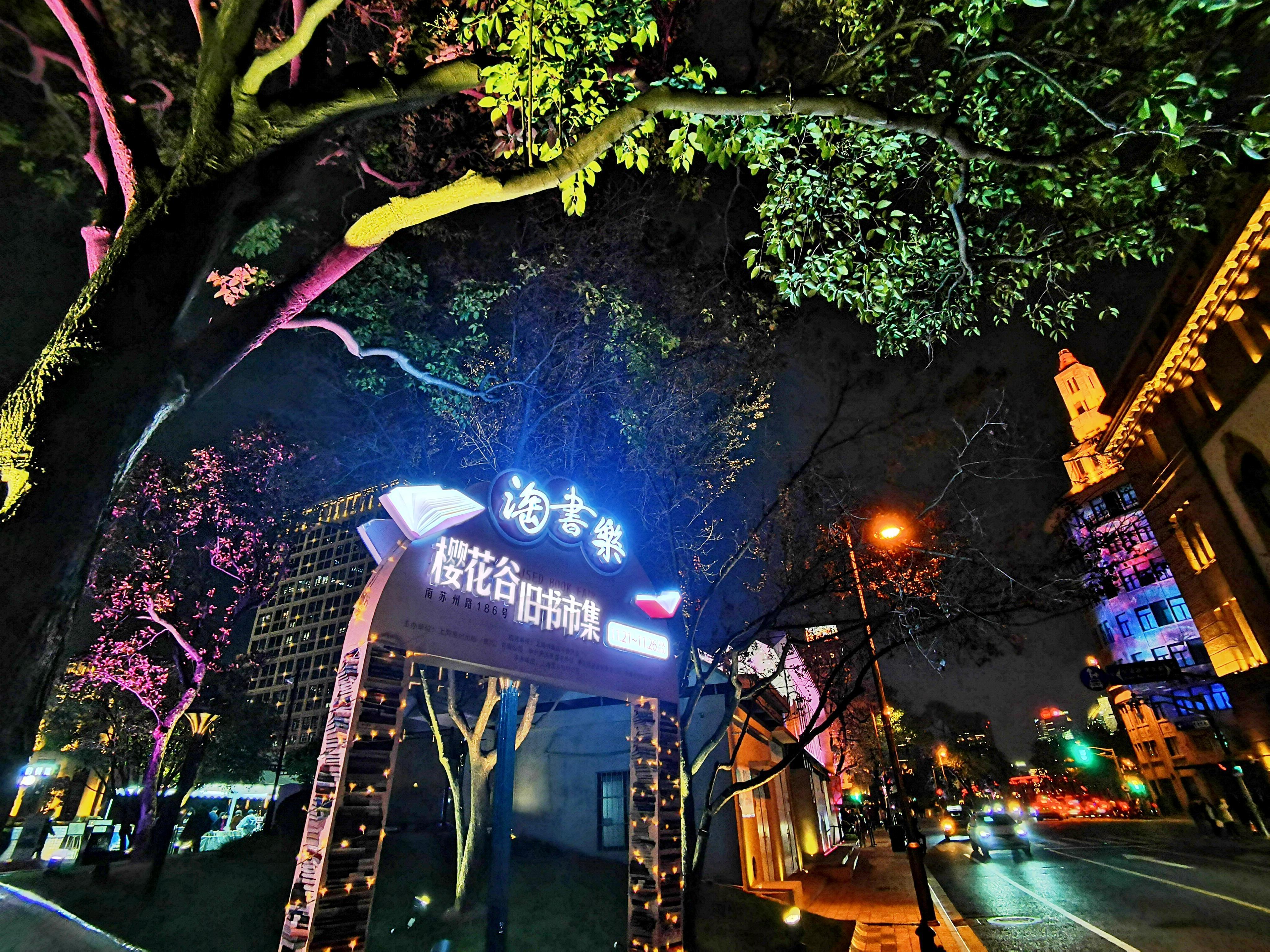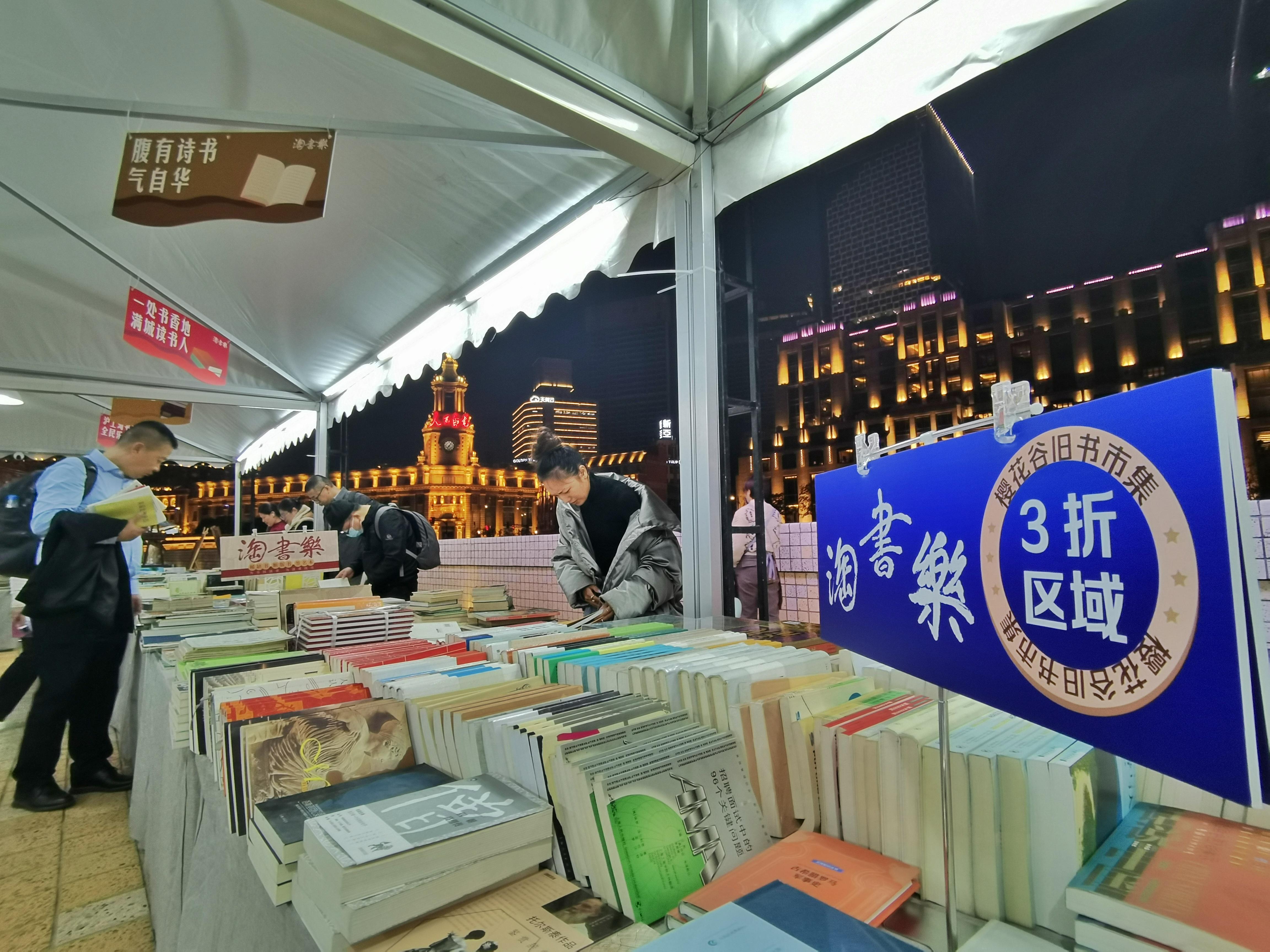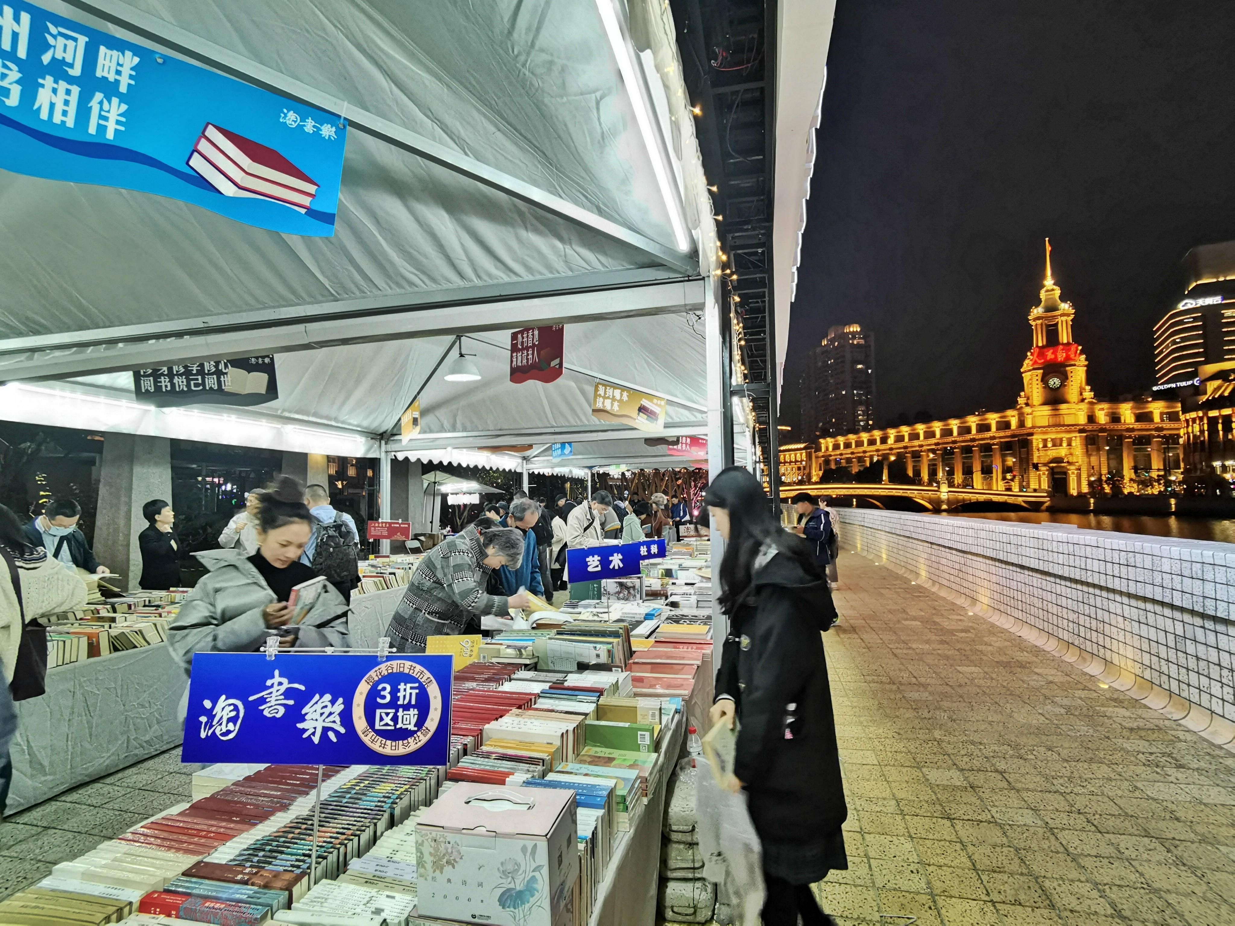 22日晚上7点,记者看到,夜色下的樱花谷书香扑鼻,灯光璀璨,特别地漂亮。还有不少书迷依旧在书市中“乐淘淘”,沉浸在书香之中。“我在桥边看风景,你在风景中看书……”在苏州河畔的美丽光影秀中,樱花谷旧书市集,成了一道独特的风景。
