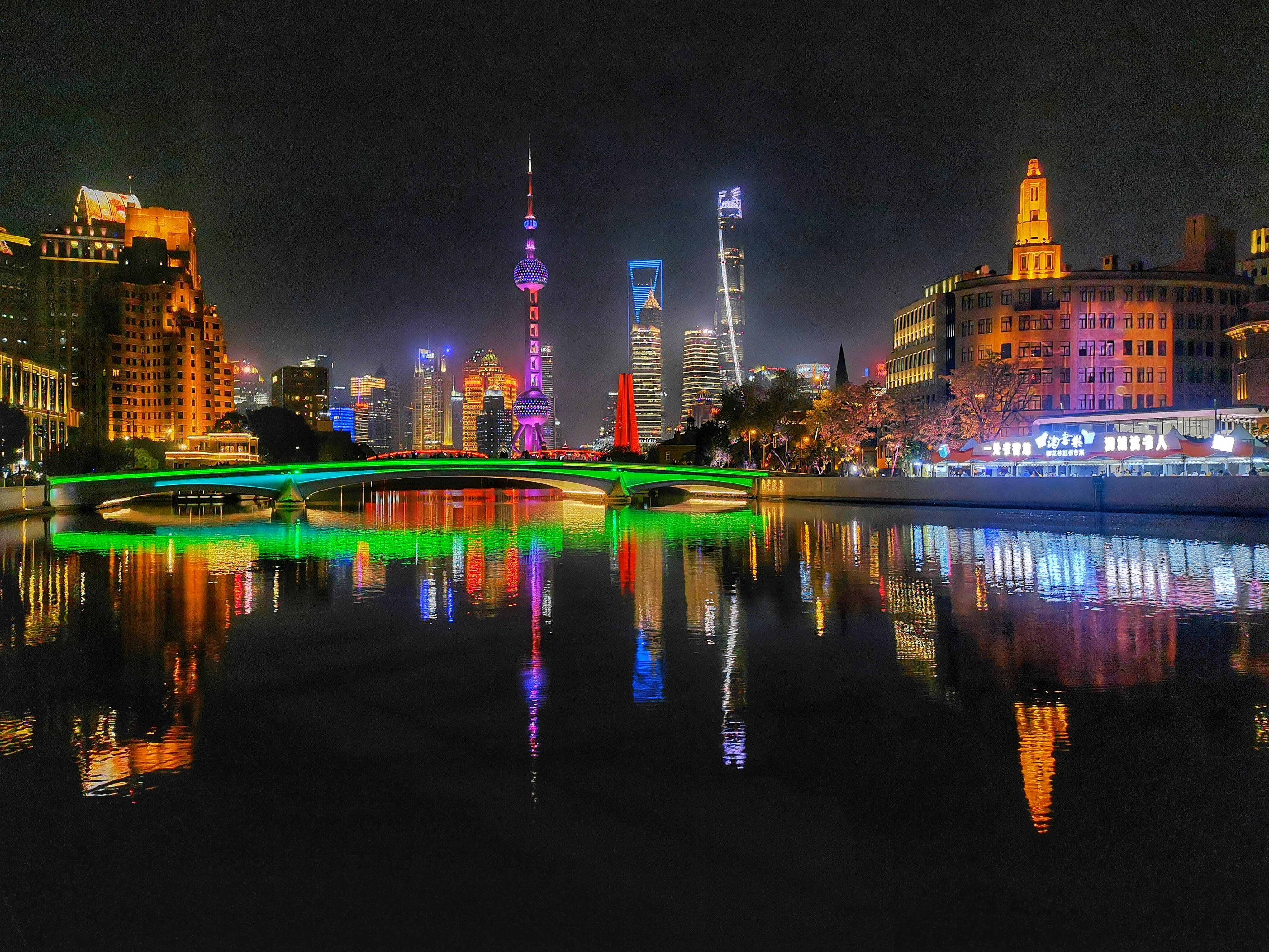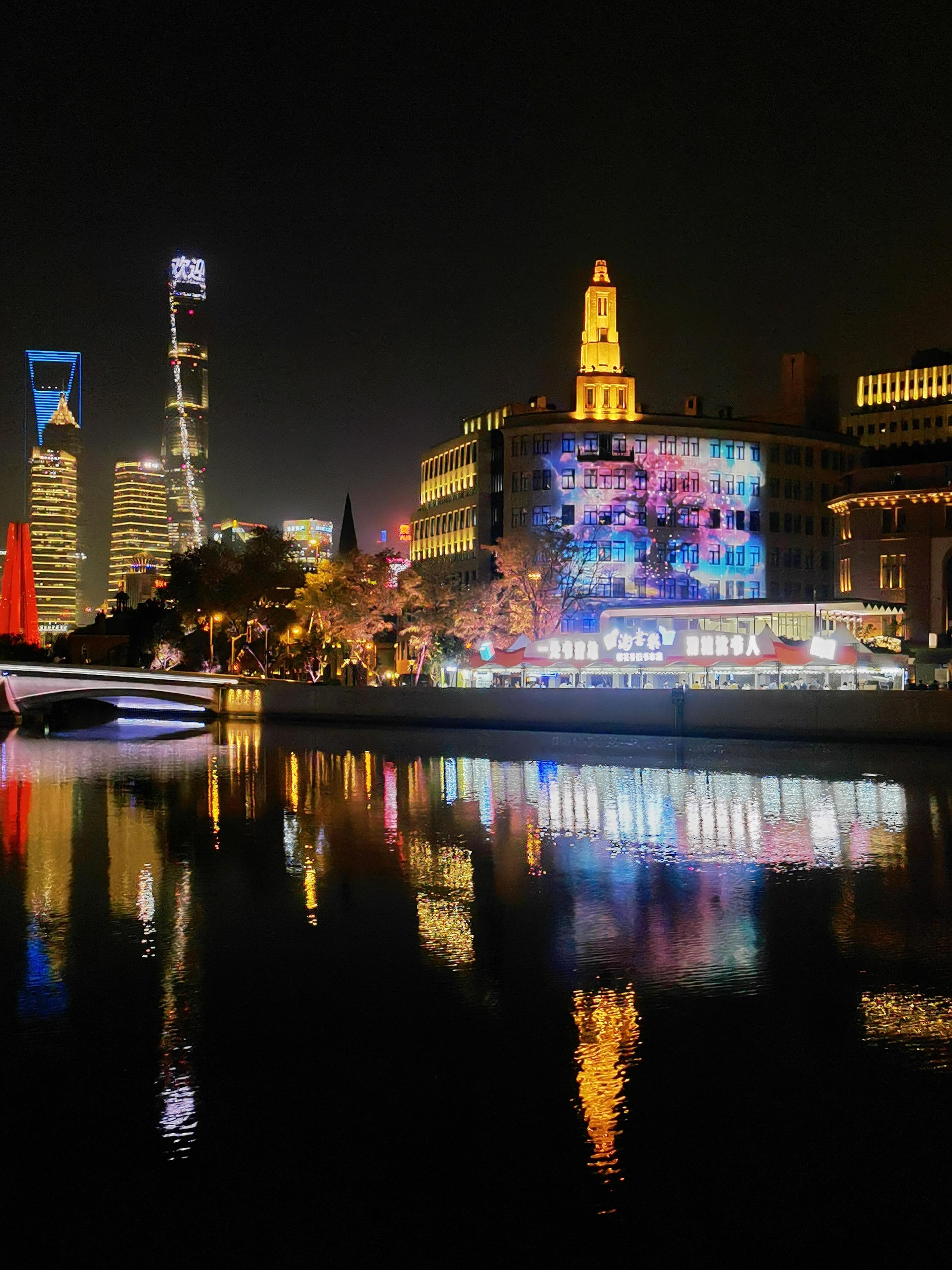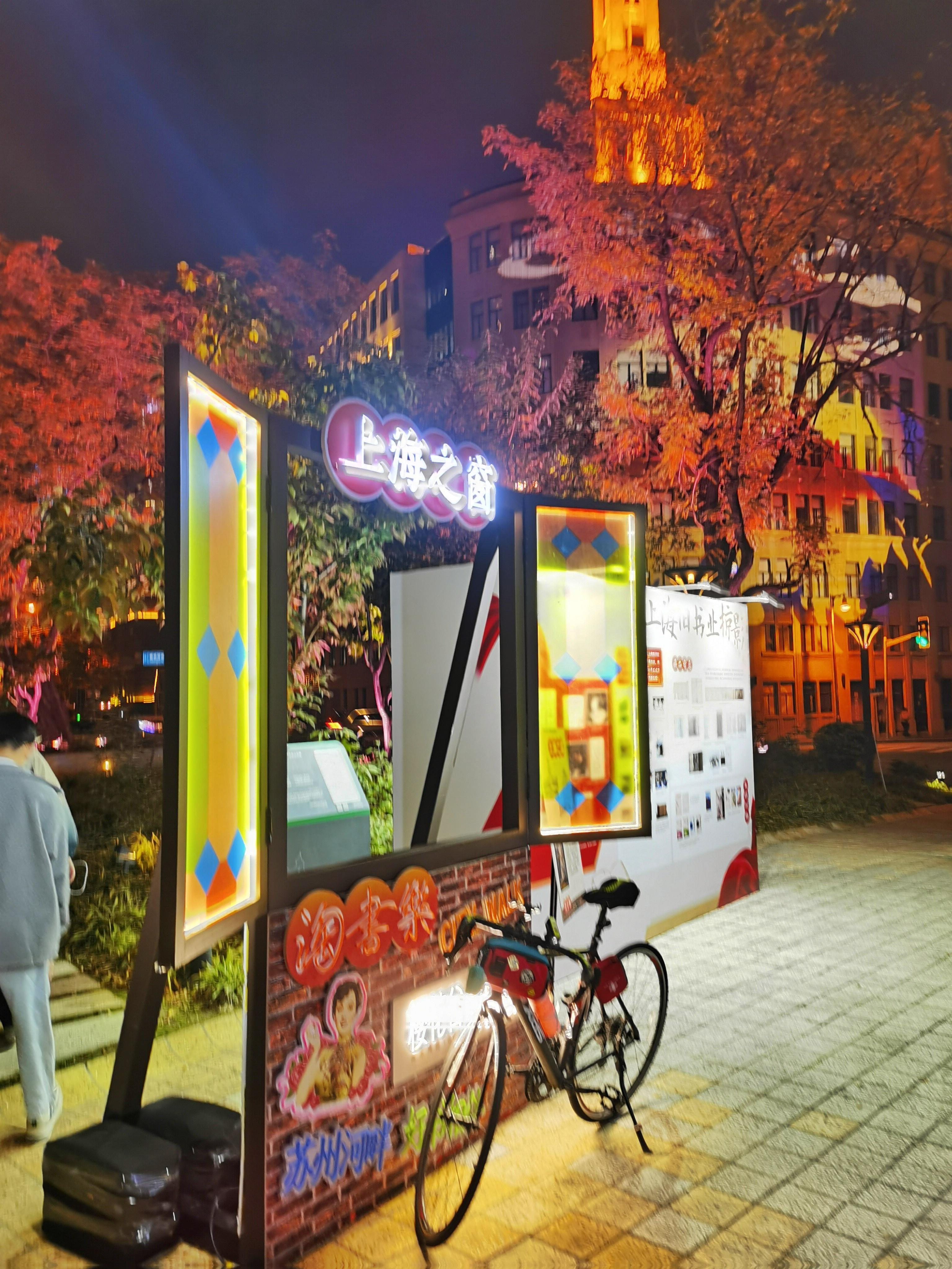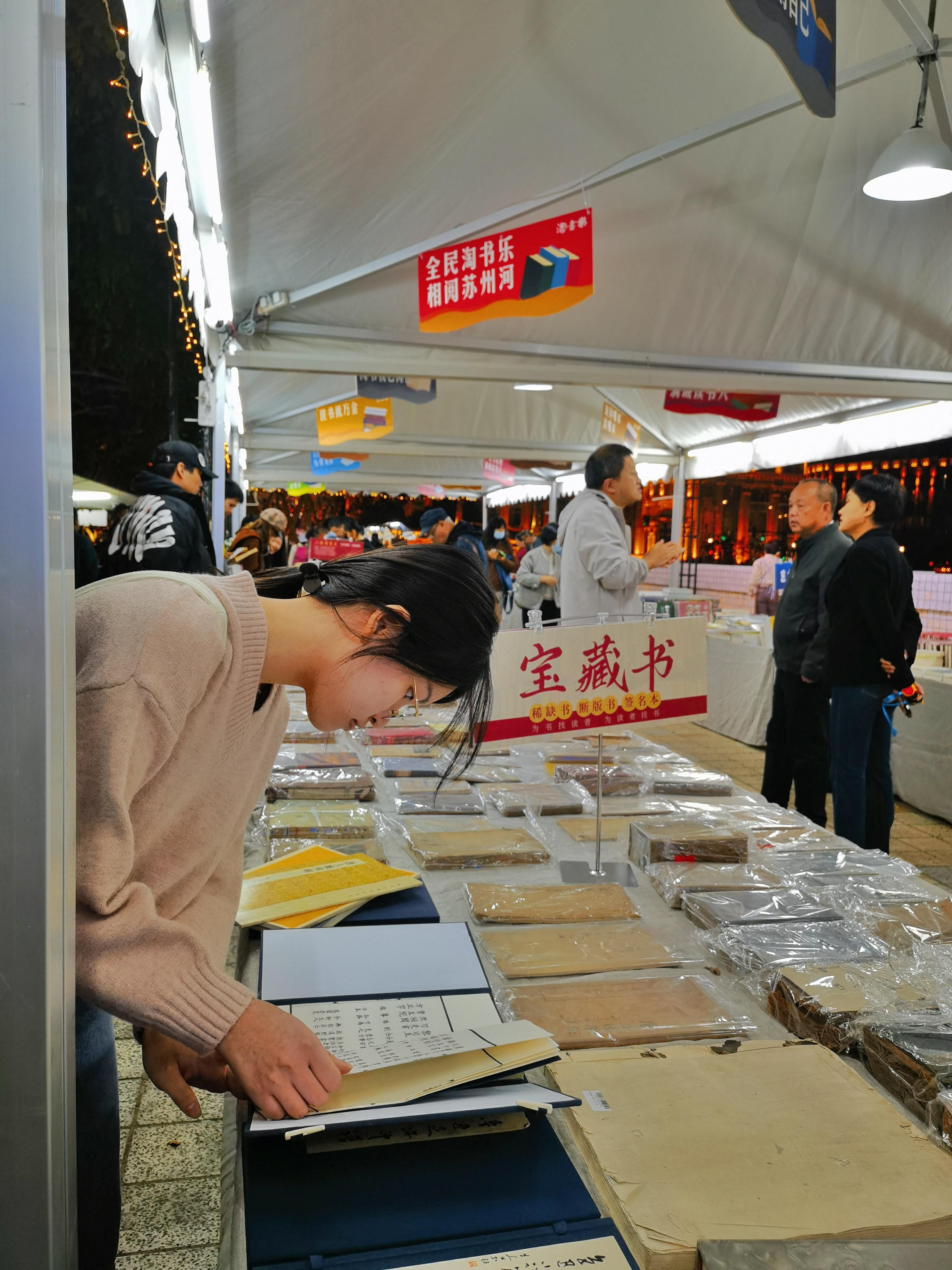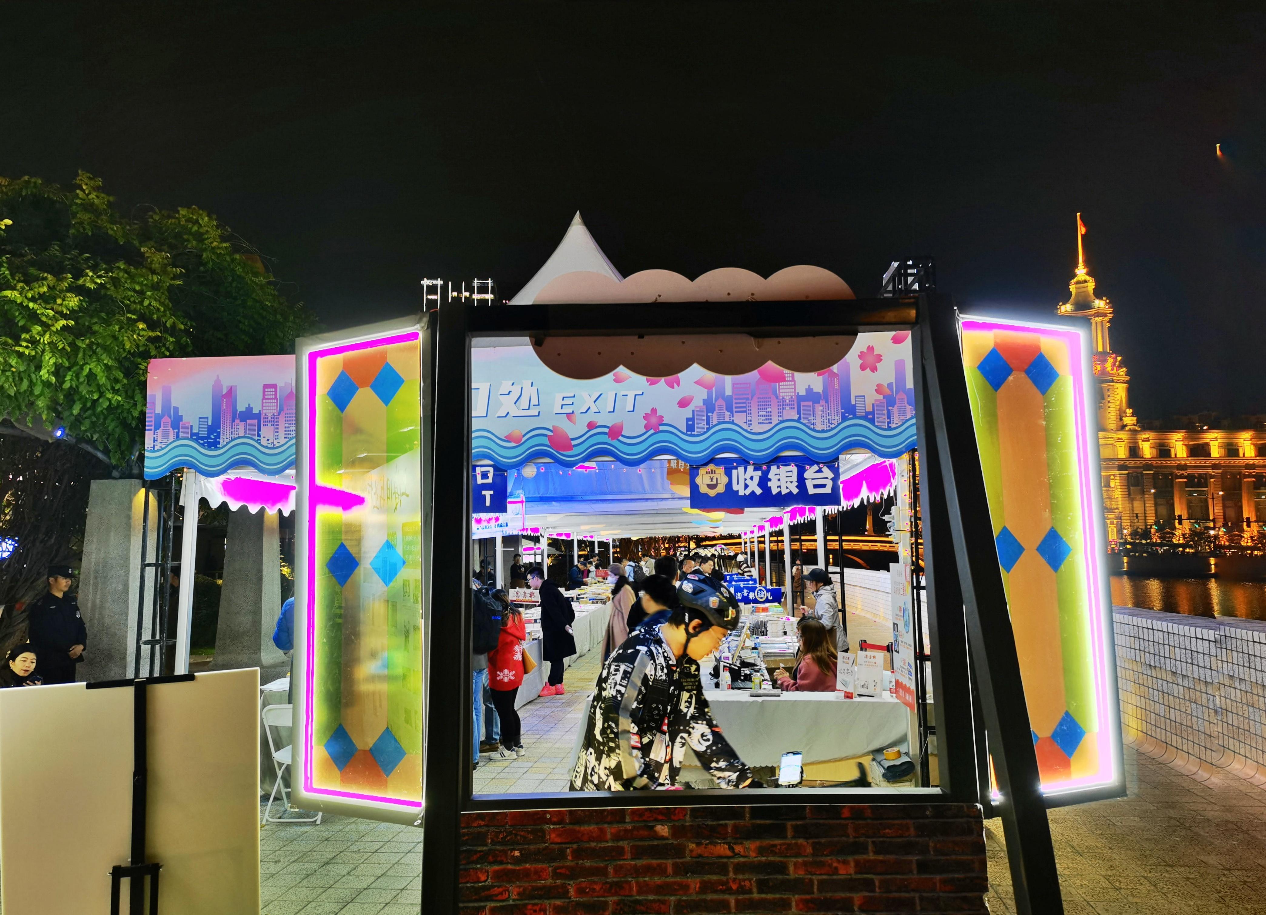 22日晚上7点,记者看到,夜色下的樱花谷书香扑鼻,灯光璀璨,特别地漂亮。还有不少书迷依旧在书市中“乐淘淘”,沉浸在书香之中。“我在桥边看风景,你在风景中看书……”在苏州河畔的美丽光影秀中,樱花谷旧书市集,成了一道独特的风景。