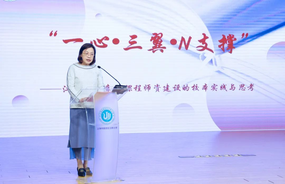 江桥小学校长高岚岚从幸福课程师资队伍建设的校本实践与思考方面作主题报告。她指出,江桥小学秉持百年传承的“严谨治学,厚德启智”的责任教育办学理念,加强教师梯队培养,搭建成长平台,正逐步形成“全员参与,有效沟通,幸福成长”的家庭教育氛围。