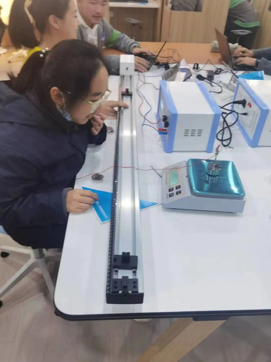 而这些实验设备的内部,还联通着一个“秘密”,每个实验设备都与电脑或Pad连接,使用设备前要用学生的账号登录,“‘深度学习平台’通过5G数字系统记录每次实验的过程、数据,我们在实验之后可以进行数据比对,通过个性化反馈,更好地复盘自己的操作过程。”同济一附中的朱同学说。