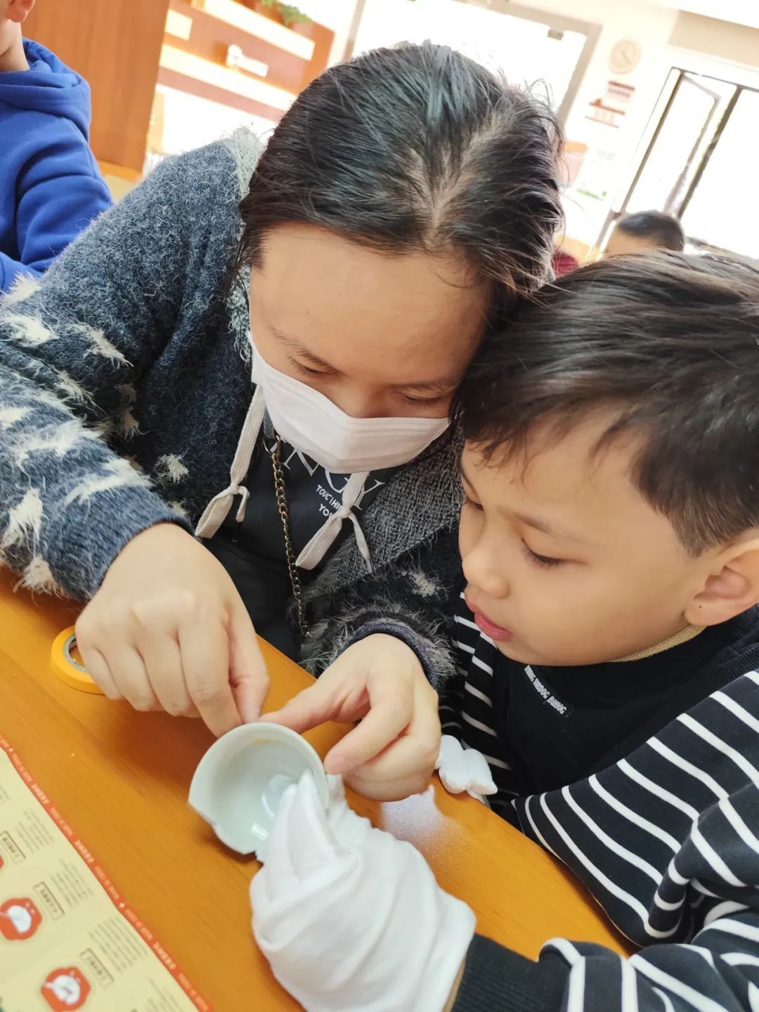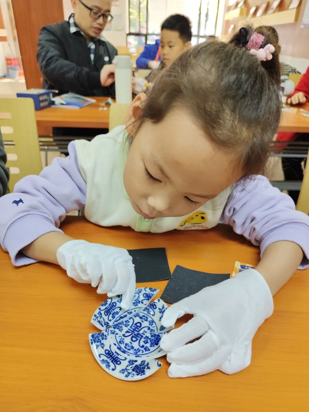 随后,工作人员为亲子家庭发放了此次活动的手工材料包——青花瓷时代的“文物”修复。在老师讲解完整体的顺序之后,小朋友们便在家长的帮助下开启了“文物”修复之旅。先是整理“文物”碎片,再用胶带固定,最后用胶水粘合。
