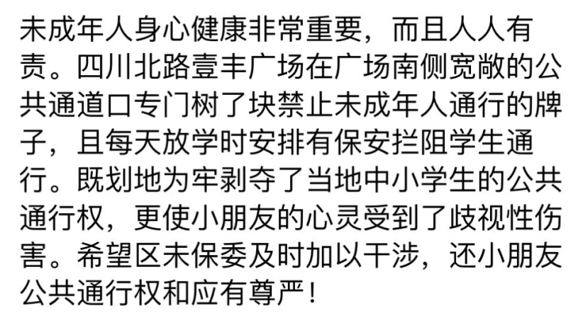 近日,有网友在“上海虹口”后台留言,反映壹丰广场办公楼前广场树立“未成年人不允许入内”的警示标牌,并在学生放学时间设专人值守。