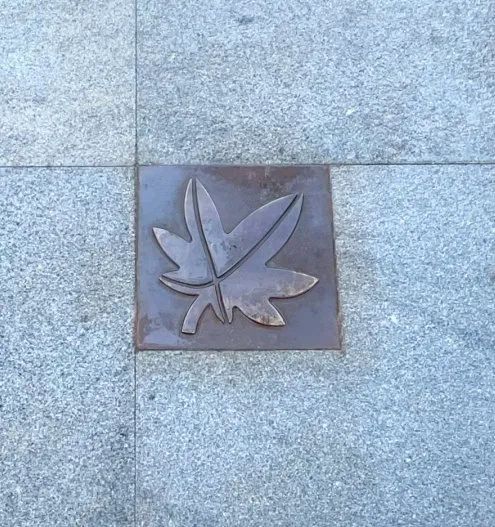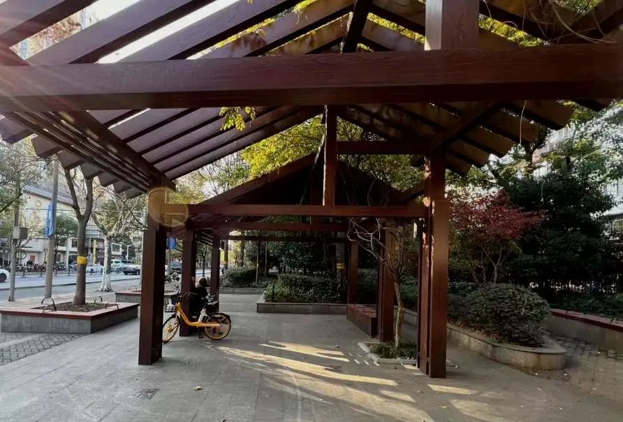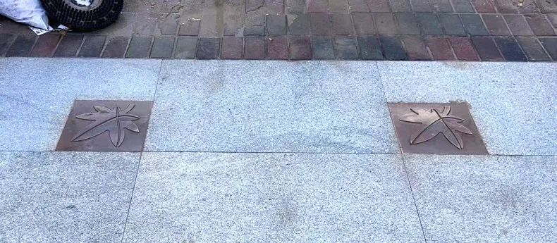 改造保留了原地坪内的4块枫叶铜片,并嵌入至花园入口石材内,寓意原绿地的延续。西侧廊架下方铺设彩色沥青,丰富整个区域的铺装效果。