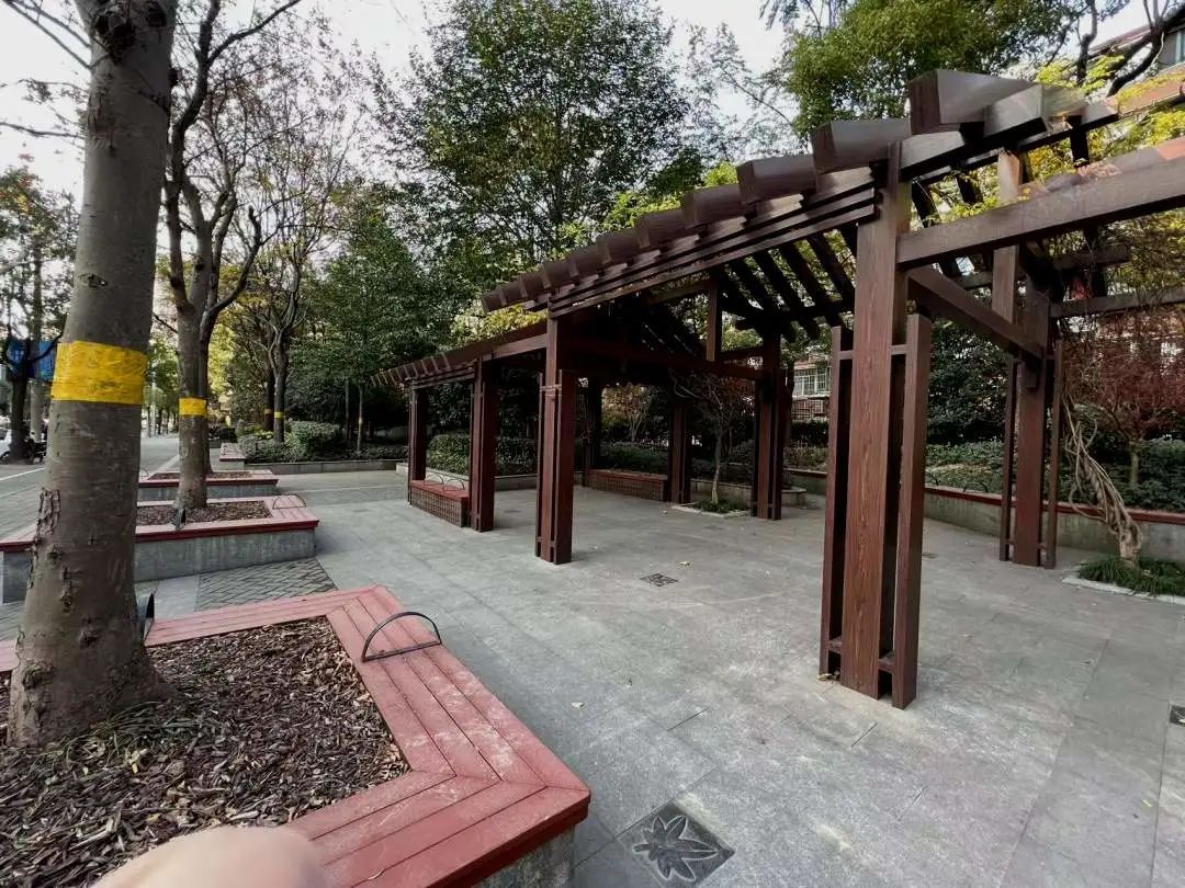 高兴花园位于虹口区大连西路246号(近曲阳路),总面积约1746平方米。本次改造将园林景观与空间功能相结合,融合思政教育、宣传展示、园林景观、民生服务等多种功能,为社区居民打造了一处家门口的绿色空间。