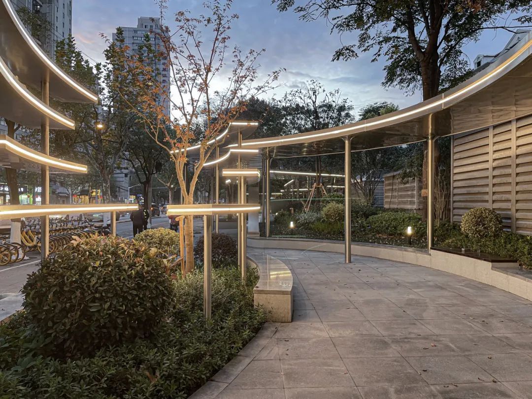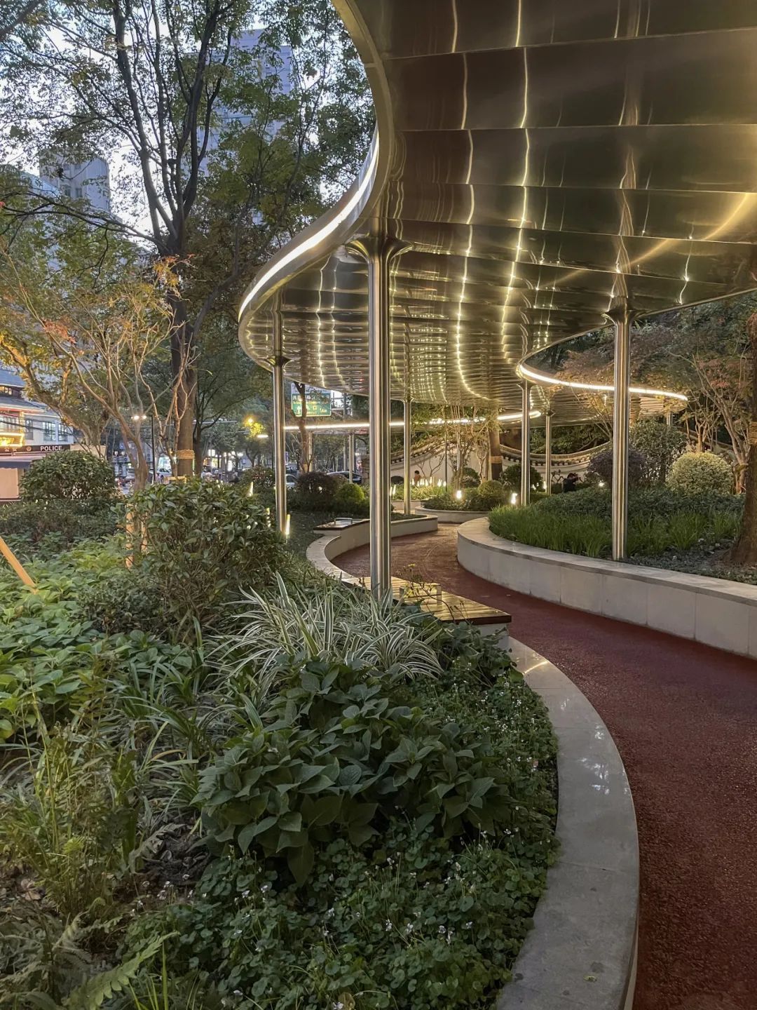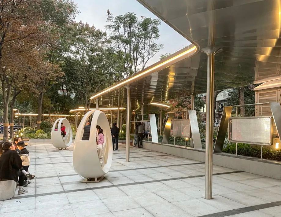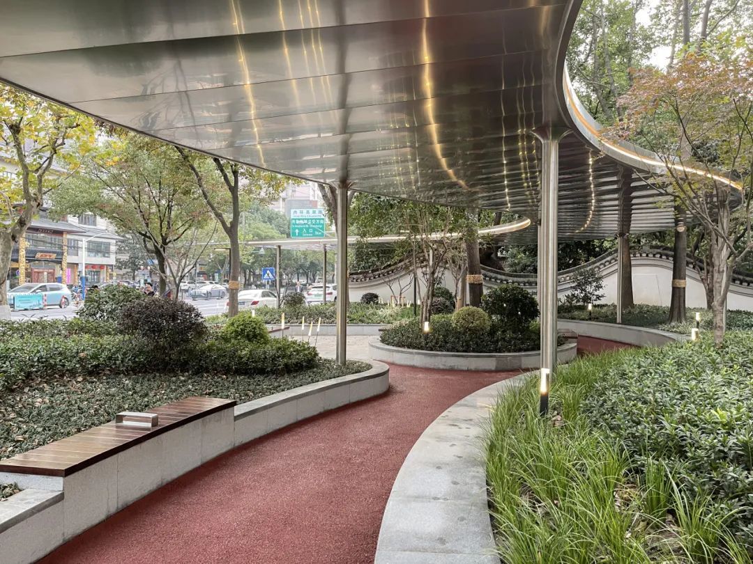 本次改造新设置的拉丝不锈钢连廊总长度约104米,与自然环境交相辉映。连廊连接着内外两个场地,并嵌入7块文化展示宣传栏,满足社区居民的社交需求。