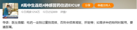近日,关于“高中生连吃4种感冒药住进EICU”的话题引发网友关注,冲上社交媒体热榜,阅读量达到1254万。