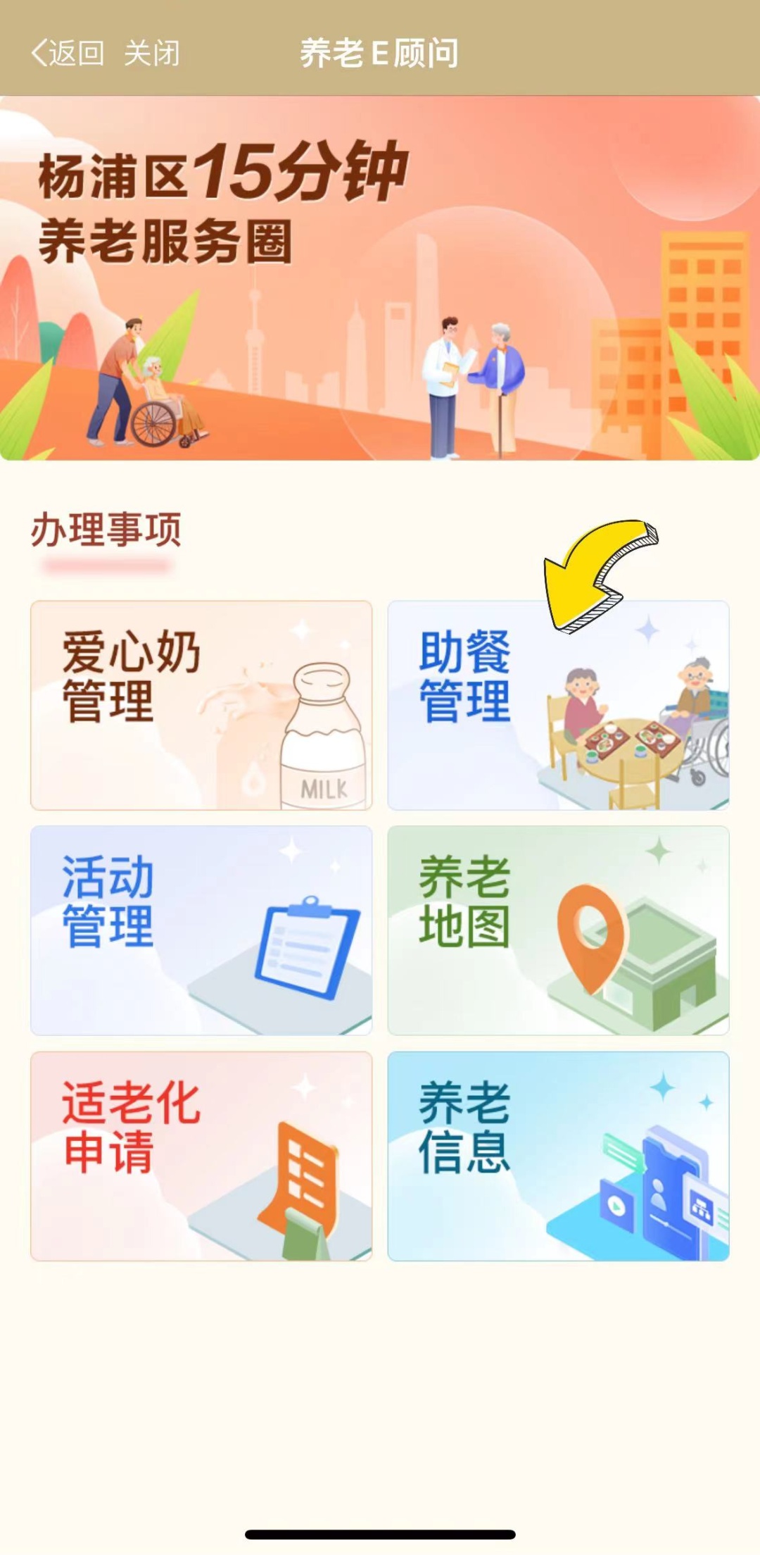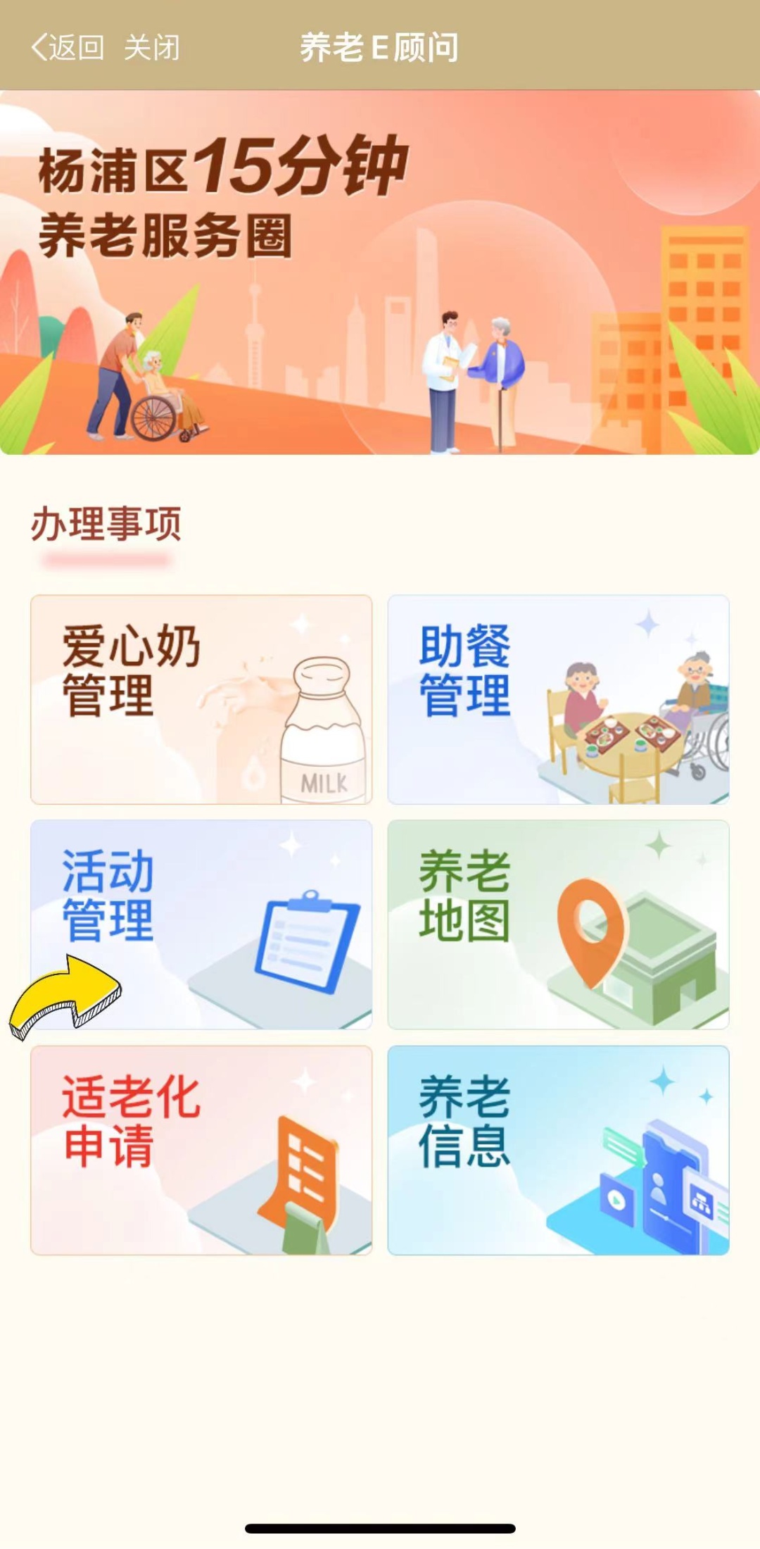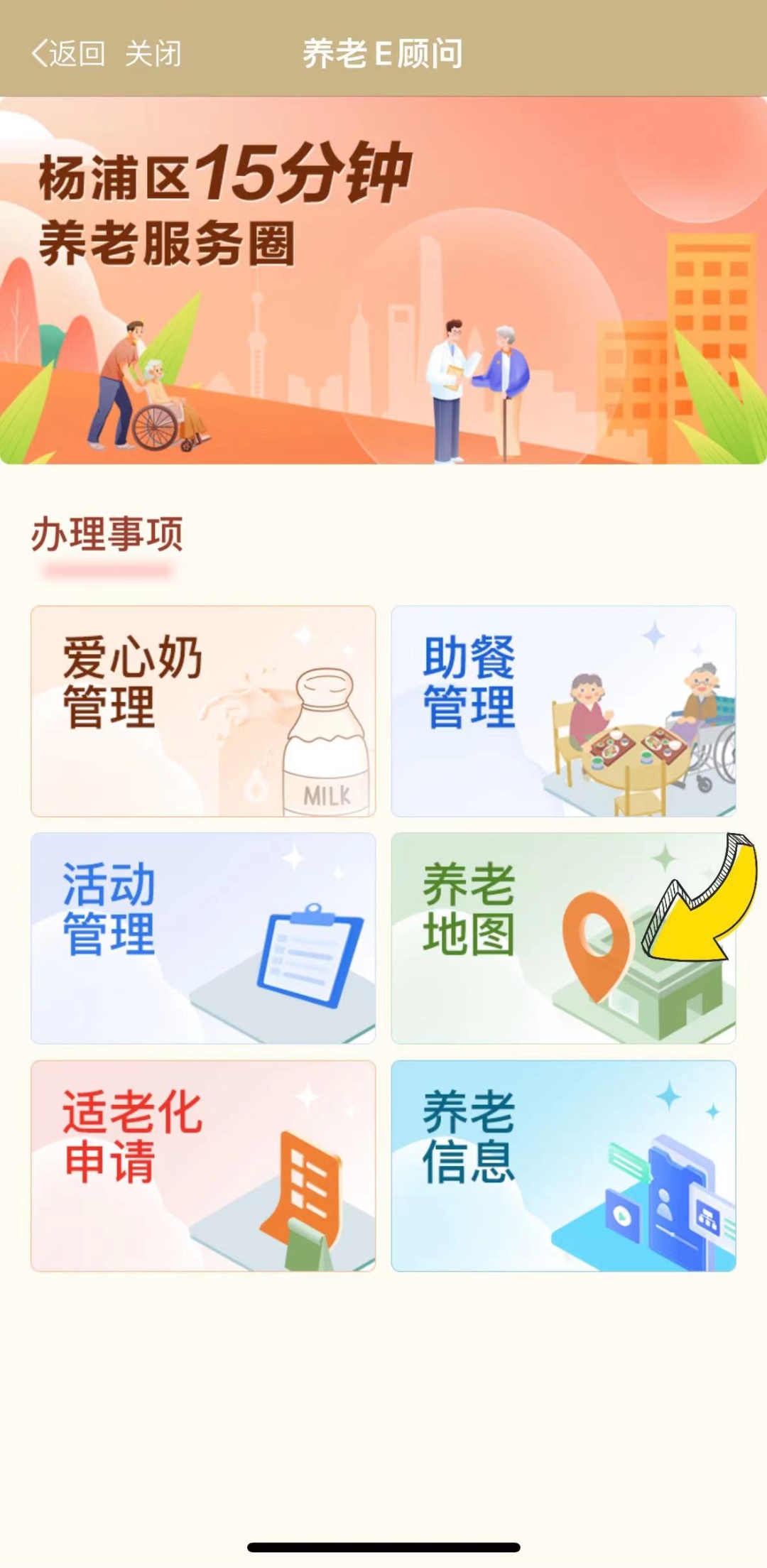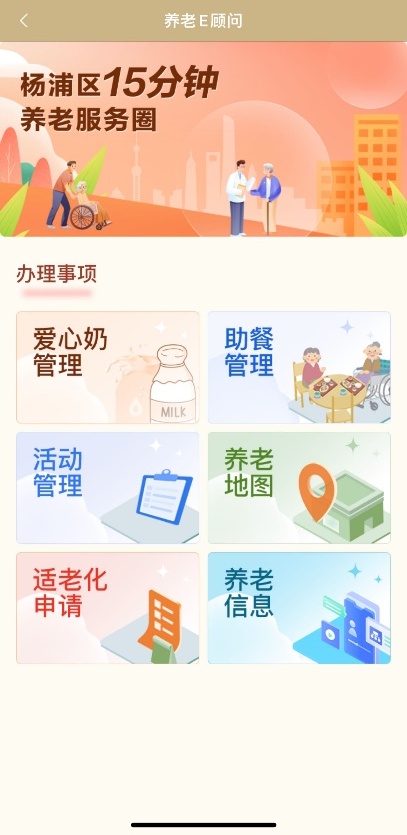 同时,在养老信息及活动管理这两项办理事项上,新增养老地图、助餐管理、适老化申请、爱心奶管理等四大功能板块,帮助杨浦老年群体更好地融入智慧社会、享受智慧生活。