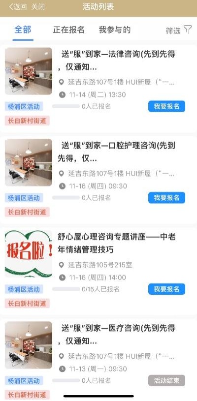 汇聚全区各类老年活动信息,涵盖老年人跨越数字鸿沟培训、老年健康、老年普法等相关内容。用户进入“养老E顾问”的“活动管理”服务即可查看活动信息介绍,按需报名。