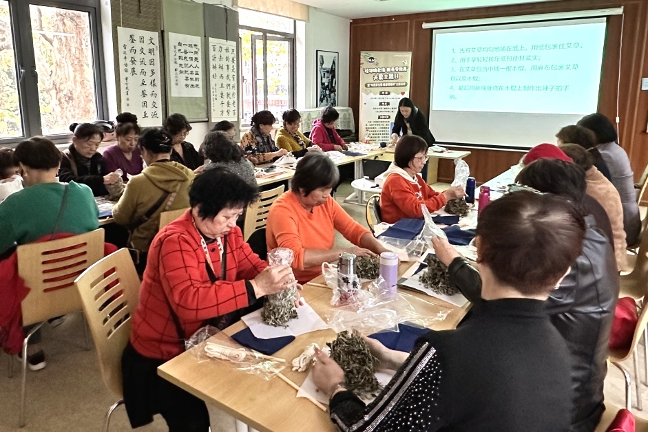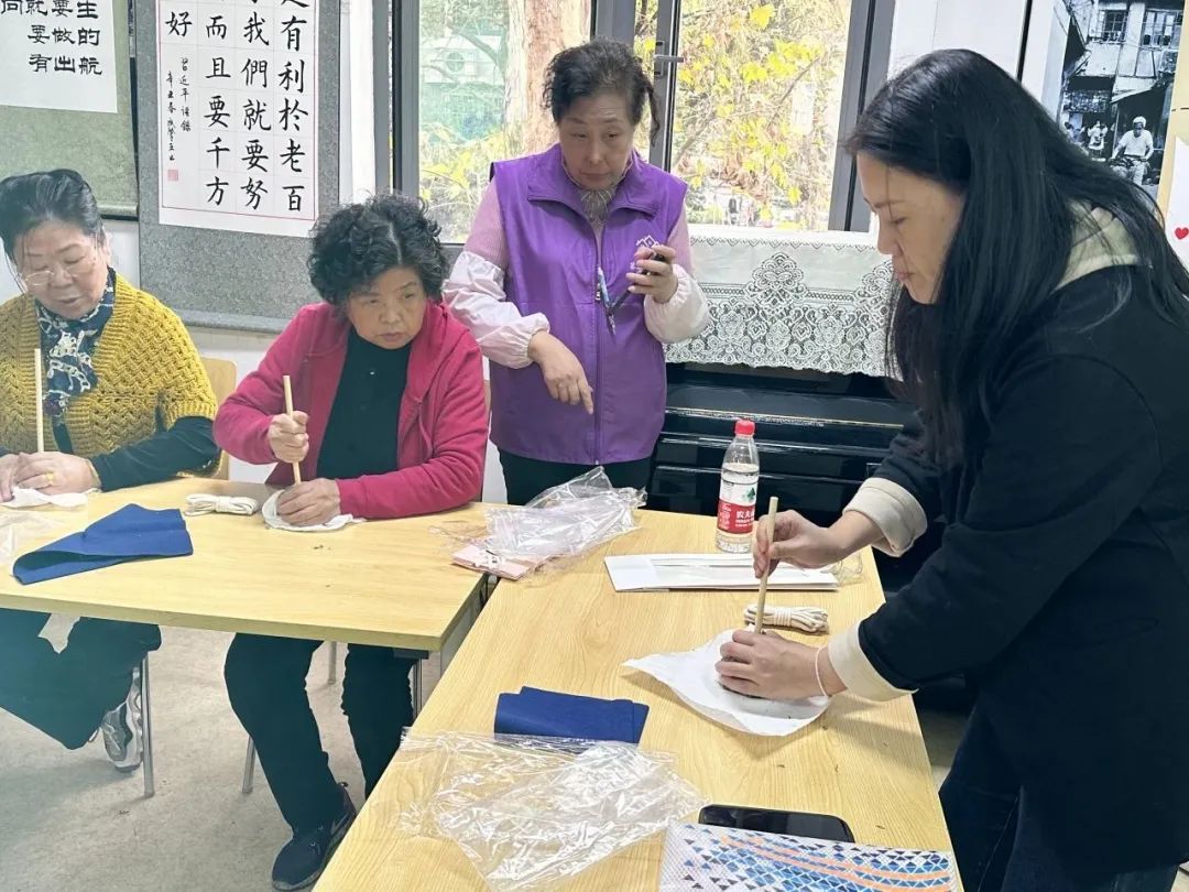 随后进入手工制作环节,大家迫不及待地开启了养生锤手工大挑战,放好药包、捏紧团球、包裹棉布、缠绕棉线……在老师和志愿者的共同指导下,大家一边相互交流,一边完善手工步骤,逐渐掌握了制作技巧,不一会儿,一个个药香扑鼻的养生锤顺利制成。大家纷纷心满意足地展示自己的劳动成果,捶捶颈椎、敲敲肩膀。现场一片欢声笑语,居民们在锻炼动手能力的同时,也拉近了邻里之间的距离。