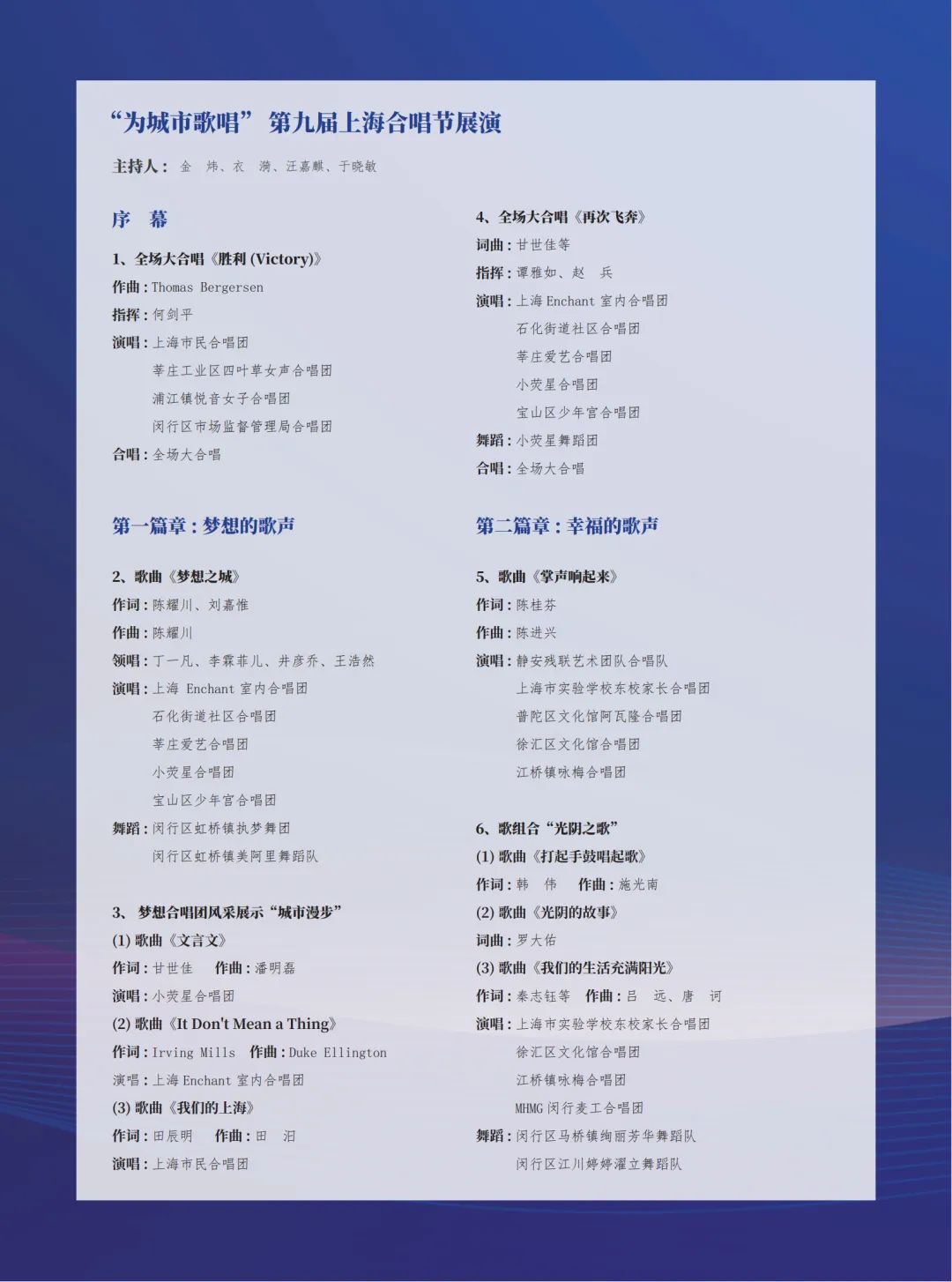 本次展演以“为城市歌唱”为主题,分为“梦想的歌声”“幸福的歌声”“未来的歌声”三大篇章,由大赛的获奖团队及来自全市的优秀市民合唱团共同串联起一幅生动的人民城市音乐图景,展现出上海这座“爱乐之城”的无限活力!