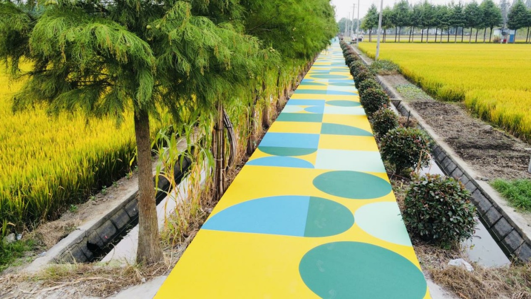 这里本是一条普通的机耕道路,从村委会出发,沿张家港河至蓝布工坊、民俗陈列馆,一直可以慢行至村里的党群睦邻点、村史馆,最后抵达百姓戏台。这条不起眼的田间步道,串联起了新源村农耕文旅的各个打卡点位。