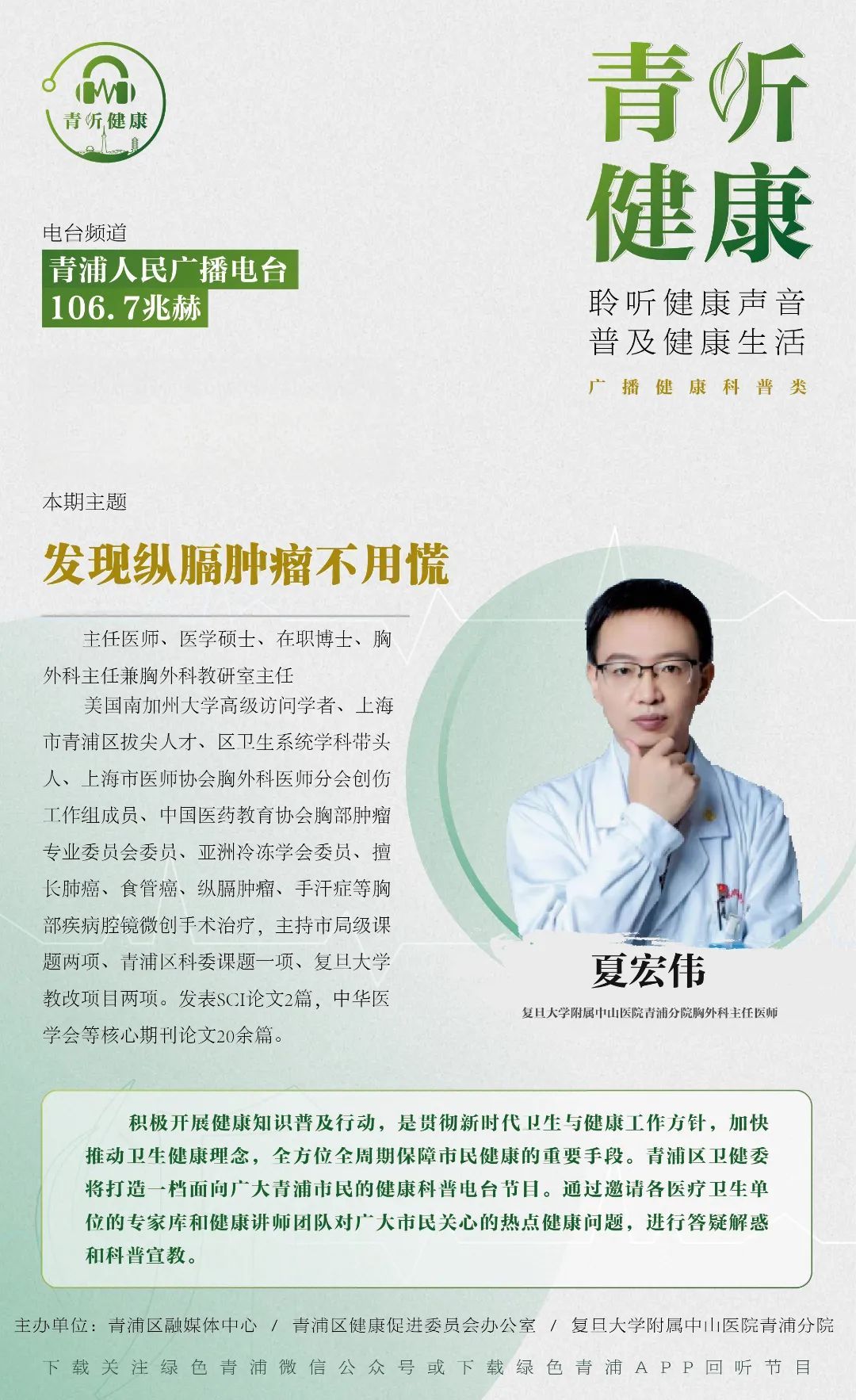 青浦区融媒体中心与青浦区卫健委联合打造一档面向广大青浦市民的卫生健康方面的访谈类节目——青听健康。以访谈问答解疑的形式向青浦市民普及一些健康小知识、常见病的预防治疗护理等知识。通过专家医生在诊疗过程中遇到的实际病例,进行详细解读,让市民关心的健康知识,在这档节目中得到解答。本期健康嘉宾:夏宏伟。