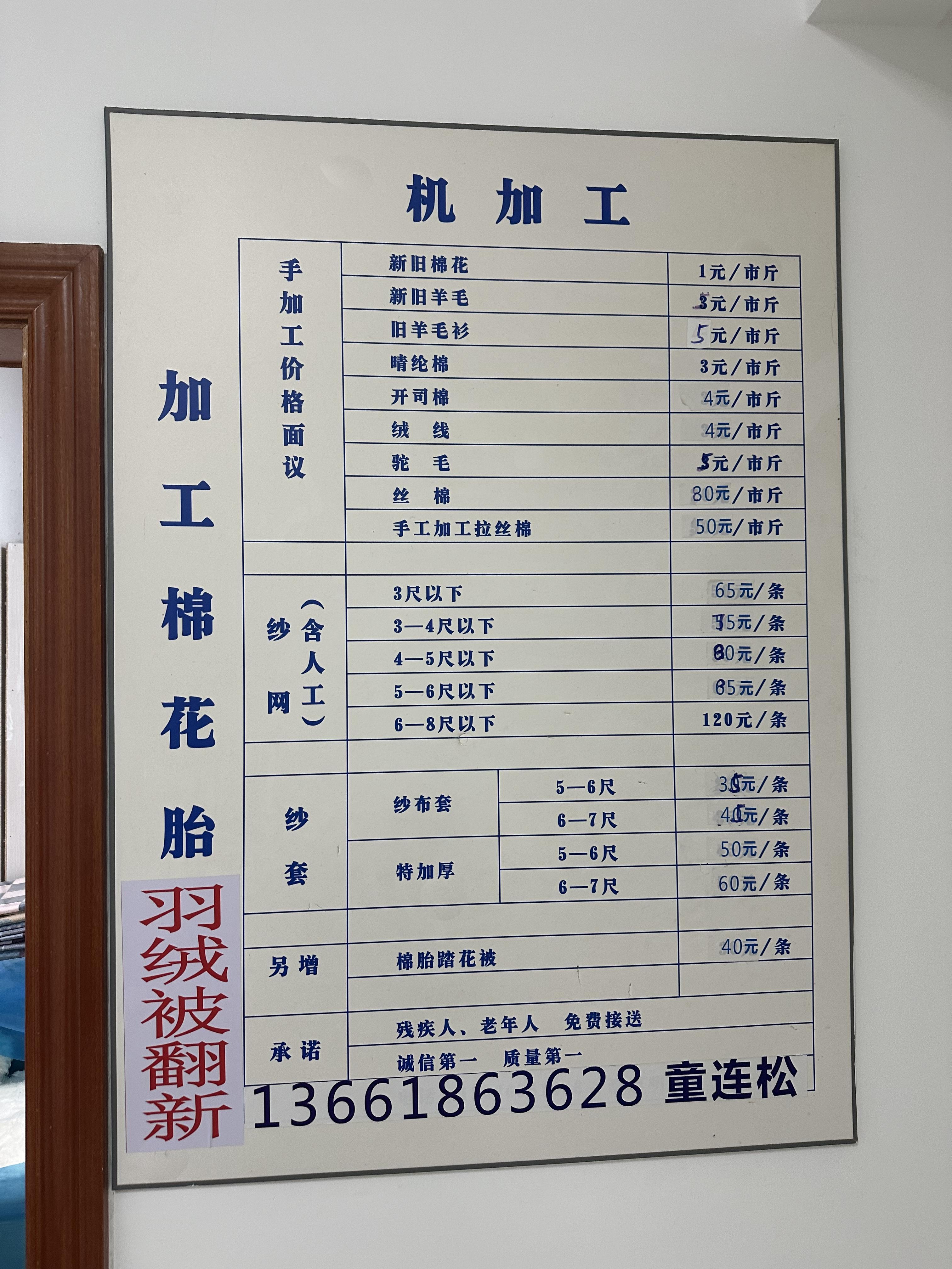 除了用棉做被子,其实家里不穿的羽绒服也有大用处。童师傅说,现在很多居民干脆把羽绒服聚集起来,一起拿到店里,直接重新充成一条羽绒被,经济又实惠。“一床被子最好三四年就翻翻,翻好了就和新的一样,性价比很高。翻新了的被子盖在身上又轻又软,很舒服的。”现场看到,现在童师傅基本是开足马力,40分钟就可以完成一条被子的翻新,不过在一旁堆积的“货物”还是来不及做。