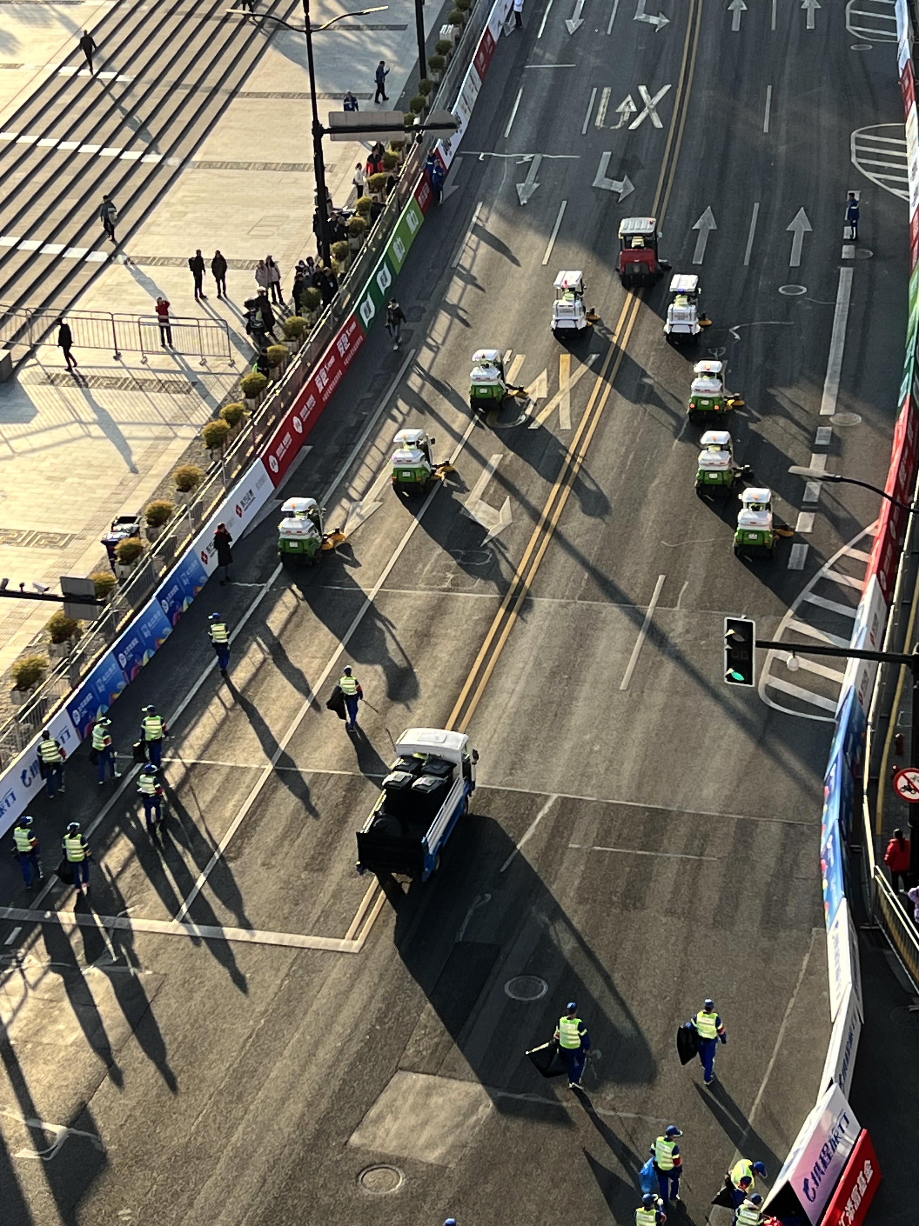 多辆新能源清扫车辆呈大雁飞行的“人”字形依次开过来,车辆驶过之处,道路迅速恢复了干净、整洁。
