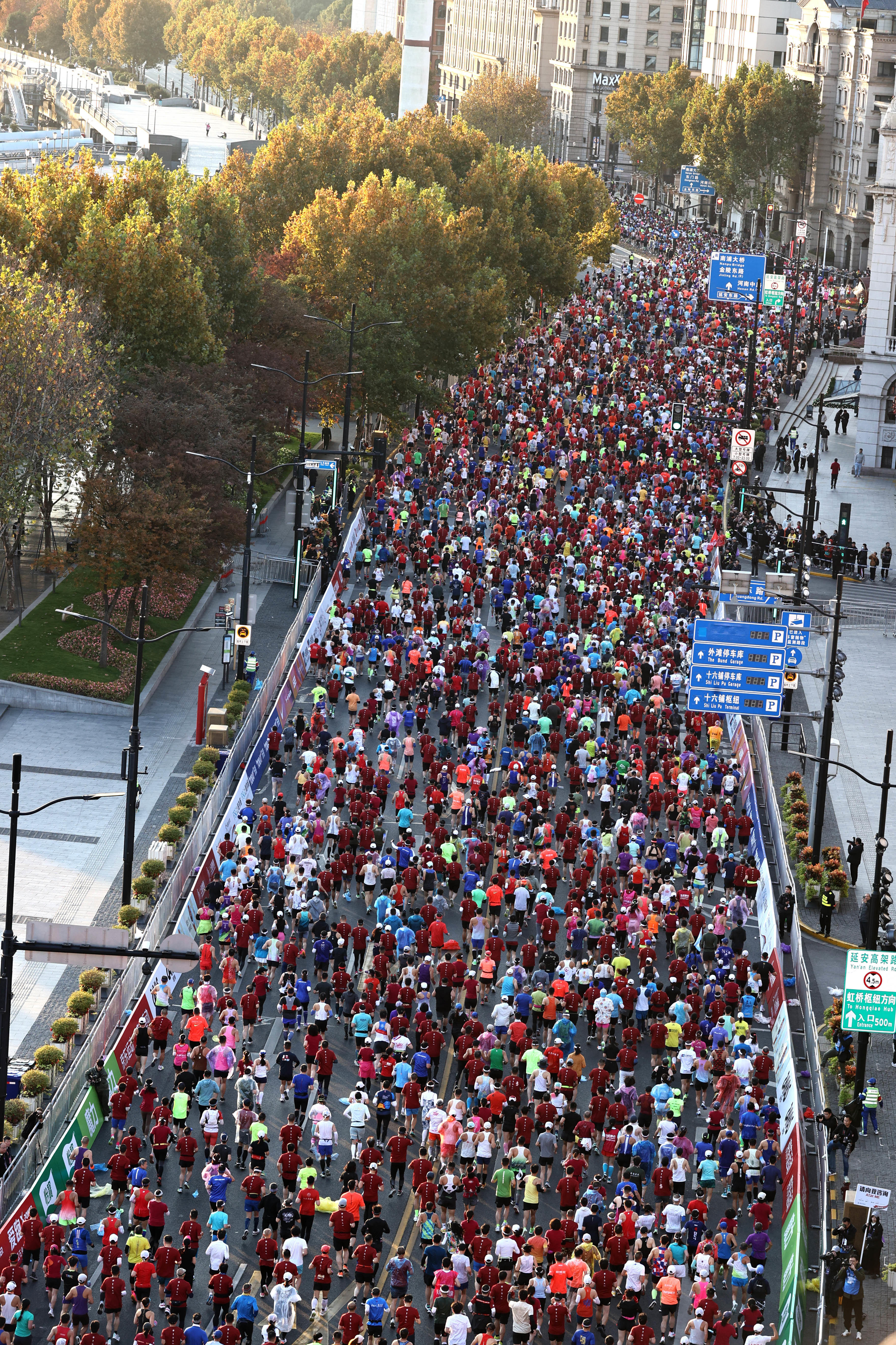 比赛从外滩金牛广场出发,3.8万名选手同枪起跑,场面壮观。