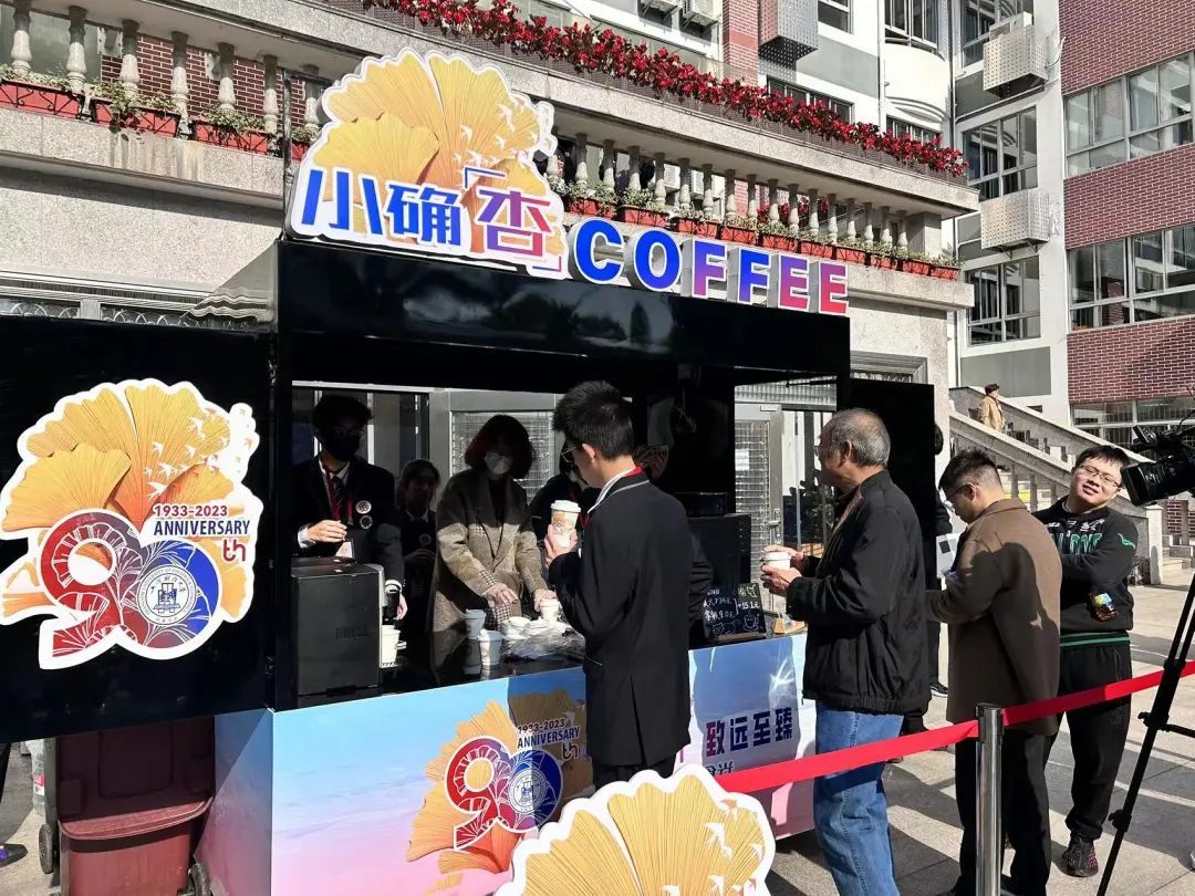 银杏树下,老同学感受着情意绵长,也被学弟学妹们蓬勃的朝气所感染。来到洋溢着浓郁咖啡香气的“小确杏咖啡吧”,喝一杯学弟学妹们亲手冲制的现磨咖啡,这座巍巍学府90年的光阴变得悠远而深邃。咖啡的价格也蕴含着“小心机”,美式咖啡每杯7.34元,寓意着曾经的校门开设在杭州路734号,拿铁每杯9.0元,庆祝学校90华诞。请老同学喝一杯,美式和拿铁一套15.1元,寓意是如今的校门开设在宁武路151号,学生们用自己的创意,致敬学校过往的历史。
