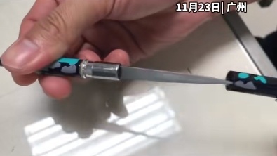 11月23日 ,广东广州,有家长发视频称,自己孩子的老师在学校内捡到一支圆珠笔,打开发现笔的一端有刀。视频中的圆珠笔从外观上看无论尺寸、样式还是颜色,都与普通圆珠笔无异,但将笔帽部分拔下后,露出的竟是一把尖刀。该家长称,老师随后提醒家长,检查一下自家孩子的文具和玩具。(图片来源:央视网)