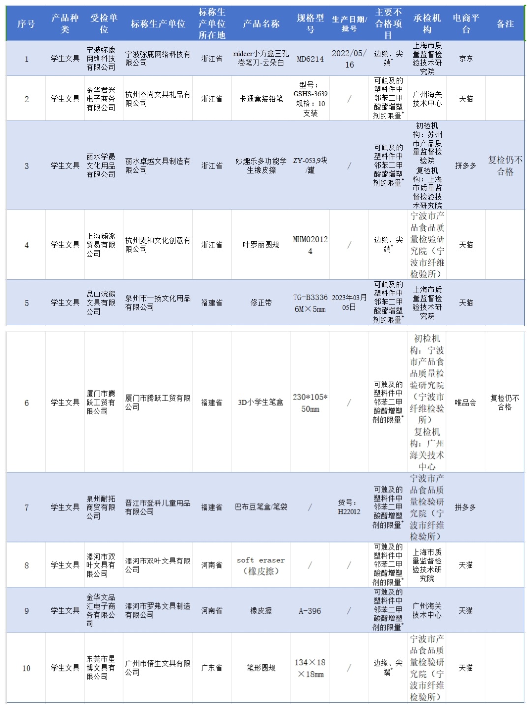 3. 标称丽水卓越文具制造有限公司生产的妙趣乐多功能学生橡皮擦,型号:ZY-053,主要不合格项目:可触及的塑料件中邻苯二甲酸酯增塑剂的限量,备注:复检仍不合格;