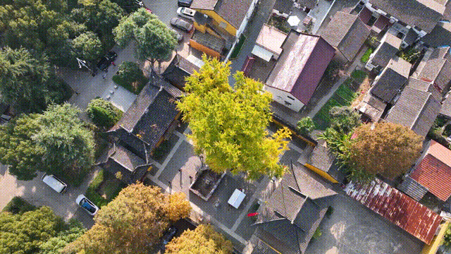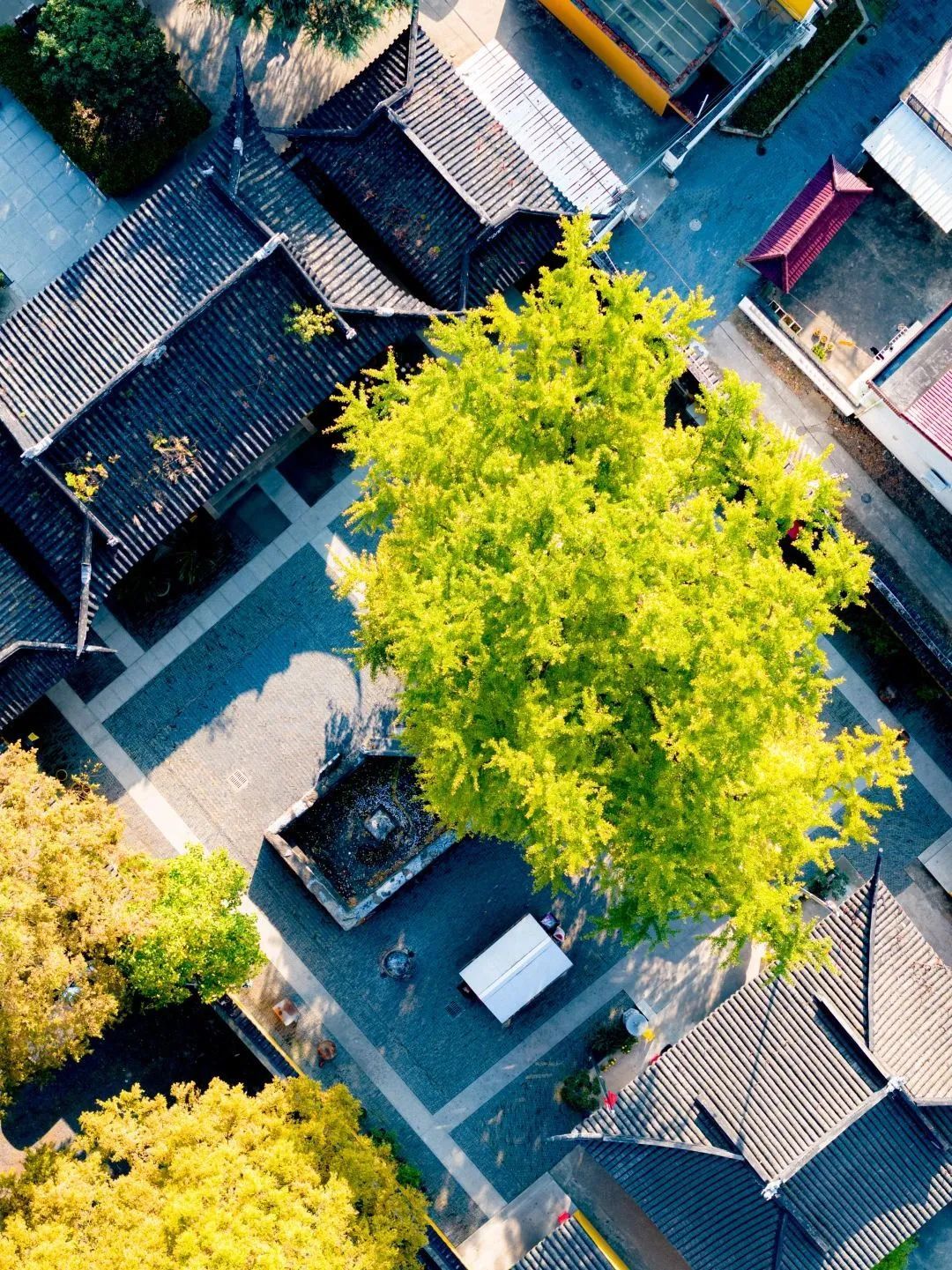 眼下,古镇的颐浩禅寺内的南宋古银杏正处于变色期,鲜绿与金黄并存。此时,古镇一年中色彩最绚丽的时节正式拉开帷幕。