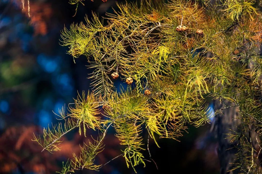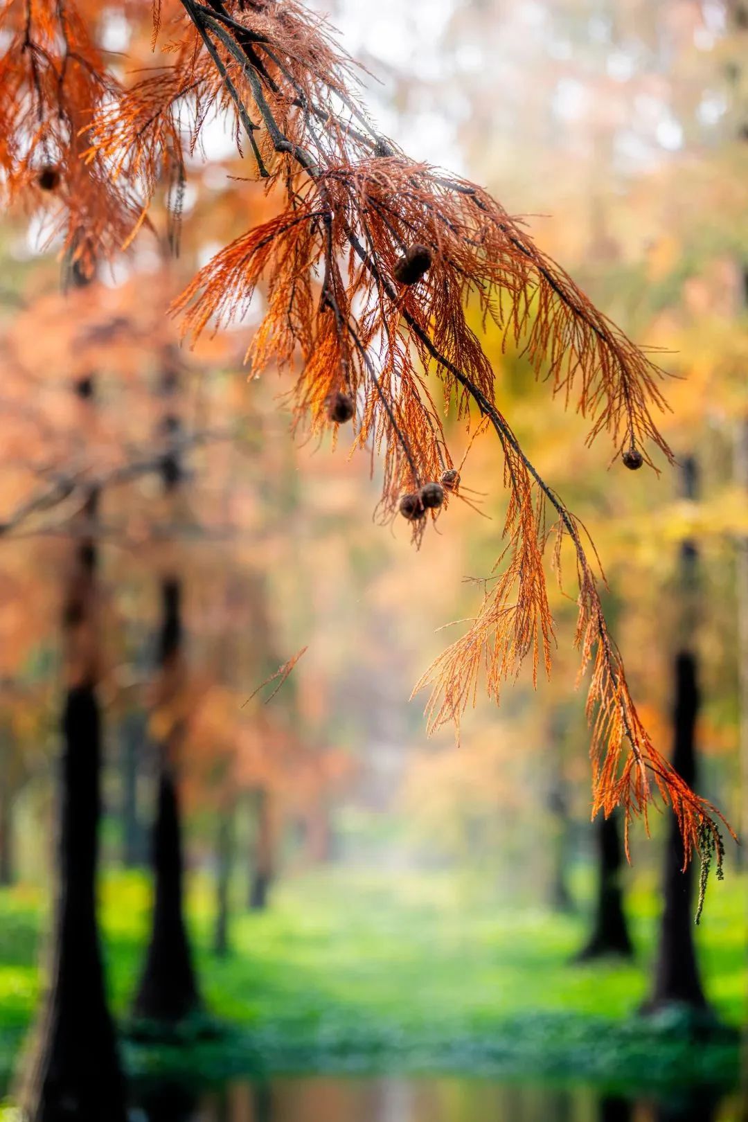 青西郊野公园内,水杉林的红色从叶脉中溢出,层林尽染披上斑斓彩衣。这种绝美渐变色,宛如天然的调色板,让人惊叹不已。站在湖边,湖水清澈见底,杉树林倒映在湖水中,像极了一幅五彩的油画。