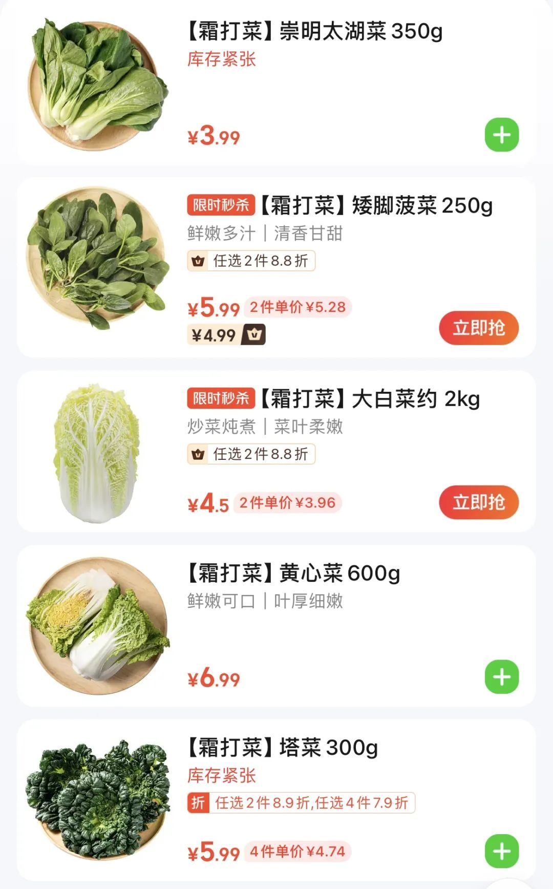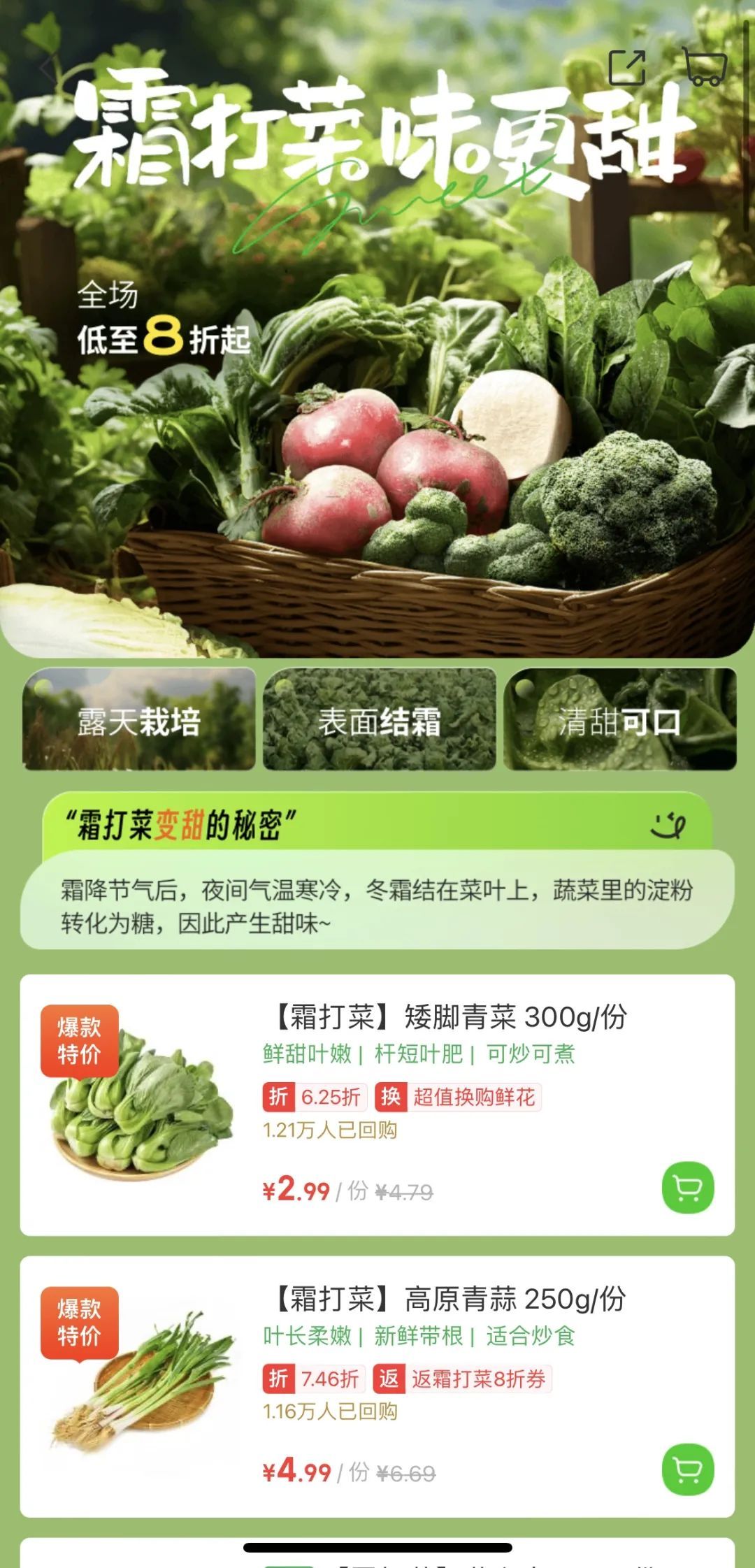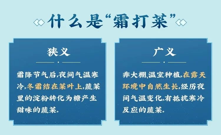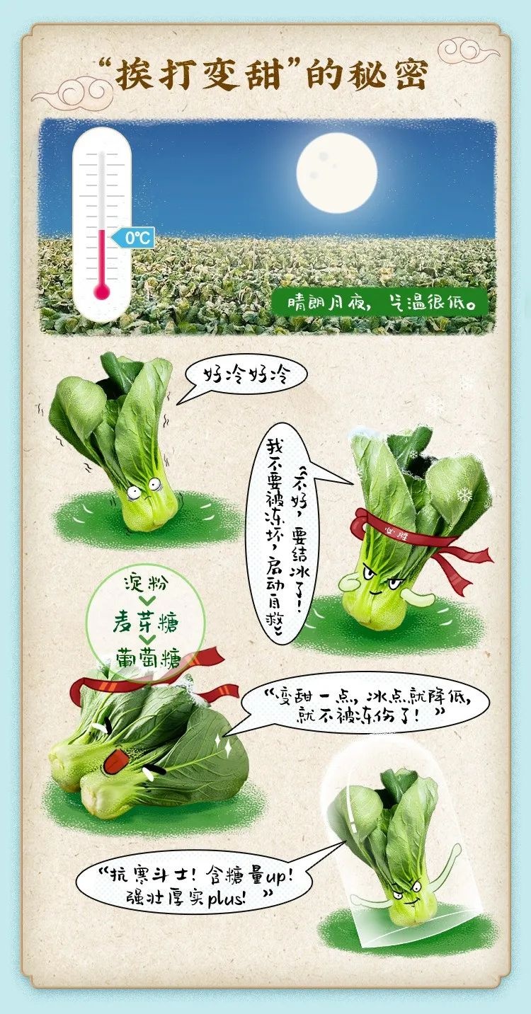 本周, 新一轮冷空气即将降临, 与低温一起来的, 还有上海人最爱的那一口“霜打菜”。 近日,冬季限定“霜打菜”的身影 又出现在各大农贸市场和线上平台, 深受消费者青睐。 霜打的蔬菜为何分外甜? 每年天气转冷,尤其霜降过后,露天种植的蔬菜尤其是喜冷的叶菜、根茎类,会将体内的淀粉更多地转化为糖分以抵御寒冷。因此,被霜“打”过的蔬菜往往比普通蔬菜要多一层清甜的感觉。 霜打菜到时令 线上线下平台均已上市 上海市的多家盒马鲜生门店已特设专区,推出“霜打菜”系列产品,部分门店虽未设专门区域,但在相应产品的外包装和价目表上均清晰标注了“霜打”字样。 据了解 盒马鲜生目前推出的霜打菜品种类有小菜心、白萝卜、芥兰苗、红菜苔等,产地包括宁夏、湖北、山东等地,这些地区气候相对寒冷;近期上市的南汇矮脚青菜是难得的本地时令蔬菜。 价格方面,一份重量为300克的宁夏小菜心售价为5.99元,250克的霜打芥兰苗售价为7.6元,线上线下售价保持一致。 叮咚买菜线上平台也已上线“霜打菜专区”,并为相应的商品加上了“霜打菜”的前缀,方便消费者选购。 据叮咚买菜介绍 今年平台还将“高山菜”“长寿乡”“太湖鲜”等消费者喜爱的特色蔬菜,加入了“霜打”行列,使其口感和营养“更上一场楼”。在丰富霜打菜品种、产区的同时,对今年霜打菜的要求也更加严格,对产地的气温要求最高在3℃左右。而来自叮咚自营农场的蔬菜则会以最快的时间进入冷链运输状态,快速锁鲜,最快当天就能送上华东市民餐桌,最大限度保证霜打菜的鲜甜不流失。 在美团买菜平台上,搜索“霜打菜”,会发现琳琅满目的选择。除了矮脚菠菜、大白菜、黄心菜、塔菜等常见品种,还有许多其他霜打菜品种可供选择。不过,由于霜打菜品的受欢迎程度,部分商品的库存已经告急,某些品类甚至在一点半左右就销售一空了。 记者走访静安区几家菜市场发现,太湖菜、塔菜、矮脚菜等霜打菜品已陆续摆上货架。 店员介绍说: 虽然‘卖相’一般般,但是吃起来很甜。而且因为天落霜,它们为了抗寒,还都长得肥肥胖胖的!这样的菜,用猪油一炒,香、甜、糯!嗲哦~” 从标价来看,上海本地太湖菜1.58元/斤、塔菜2.98元/斤,相对都较为实惠。 霜打的菜分外甜! 快去选购吧~
